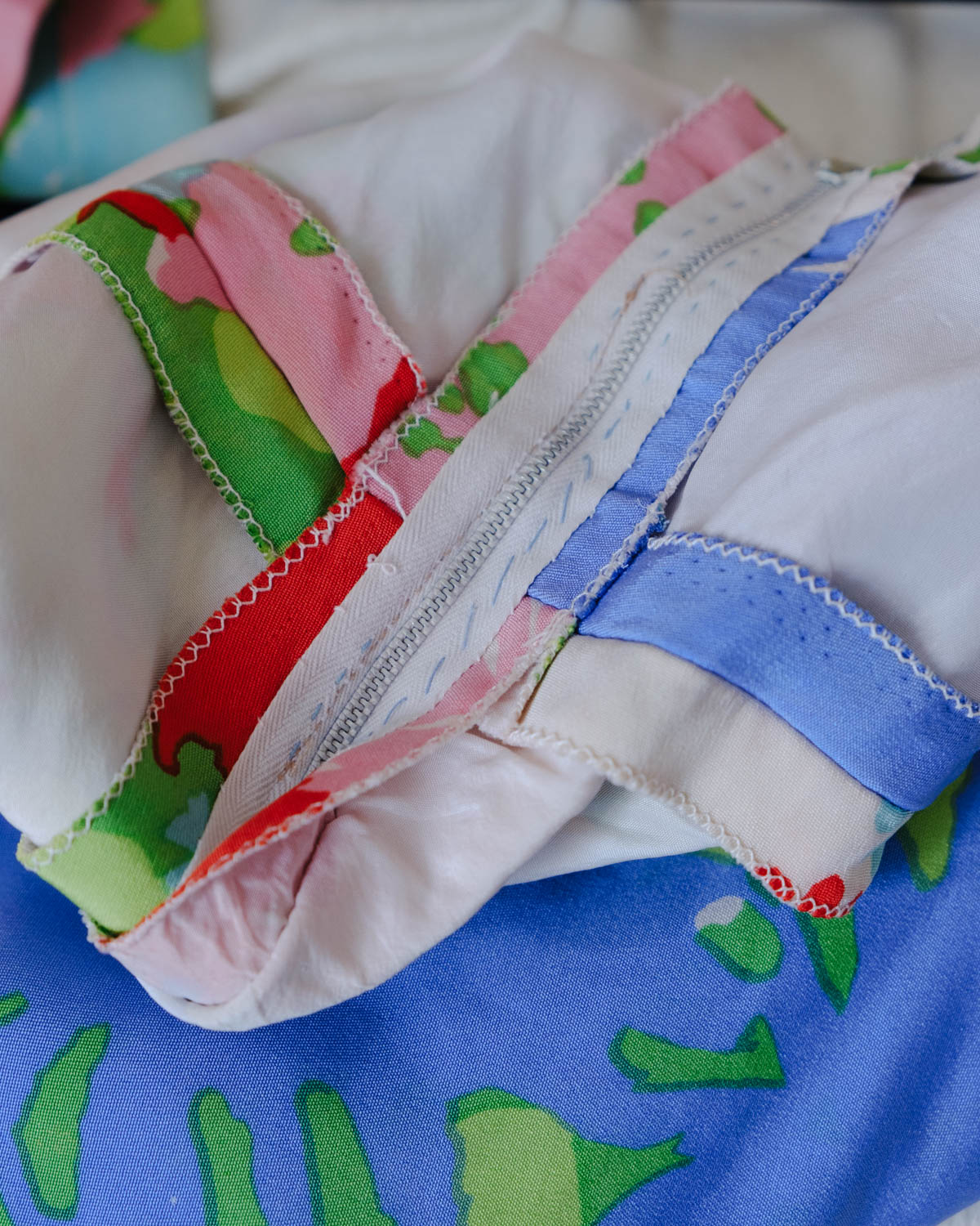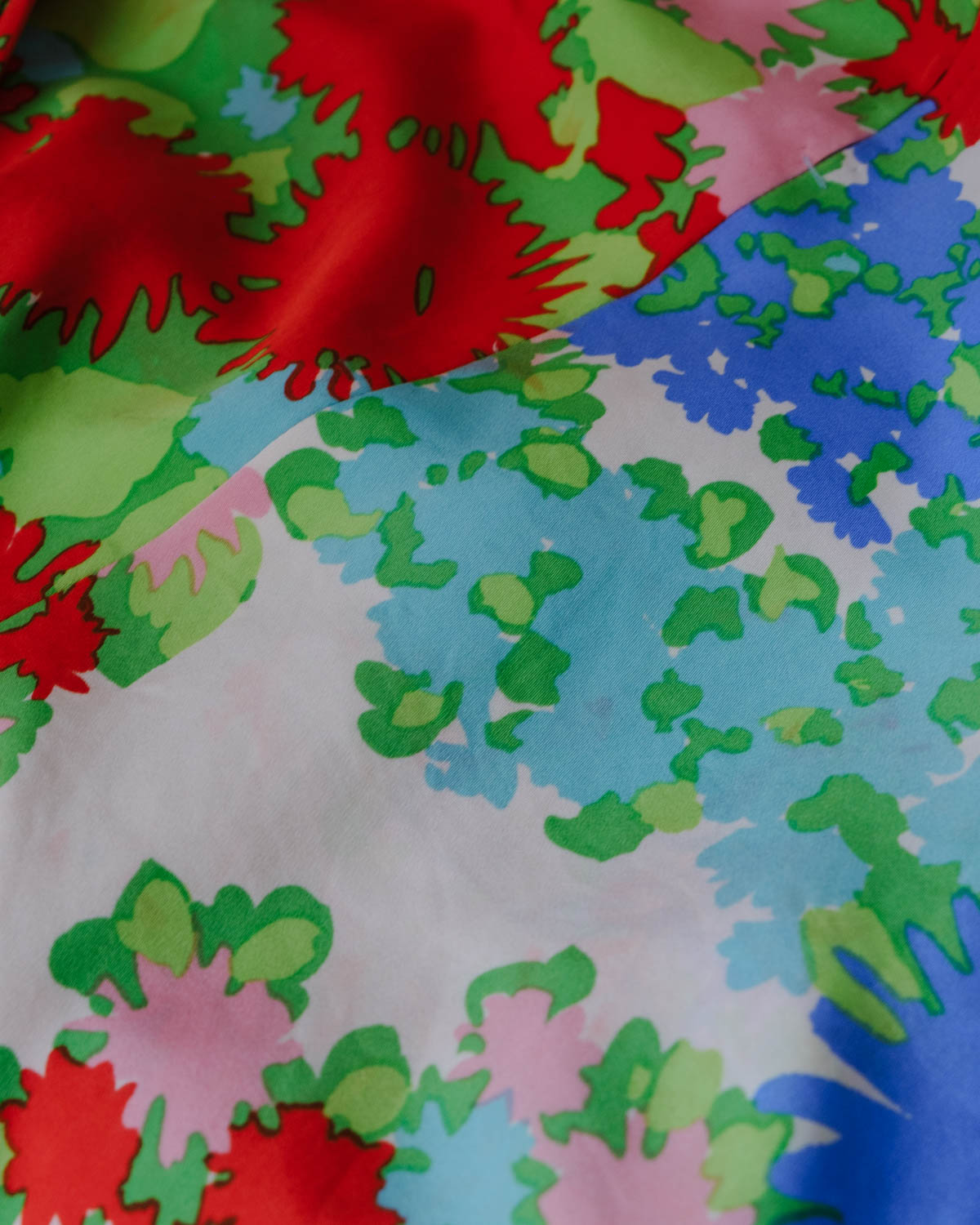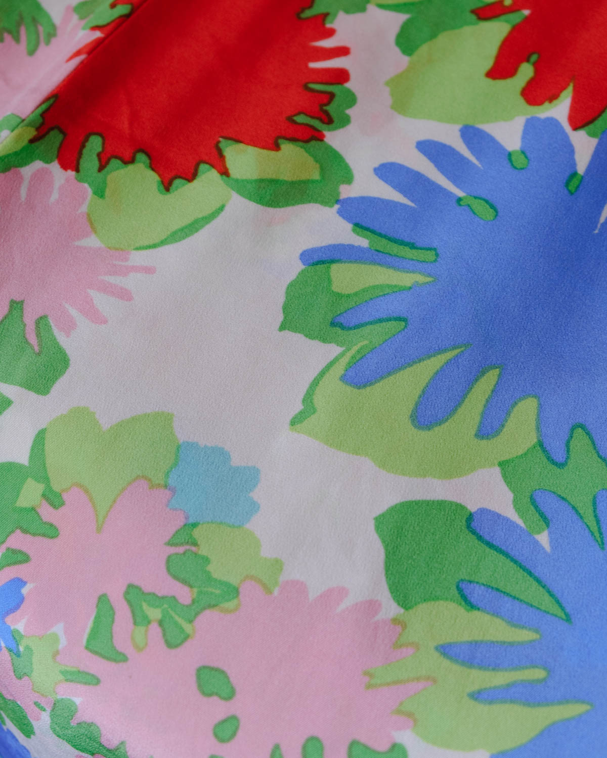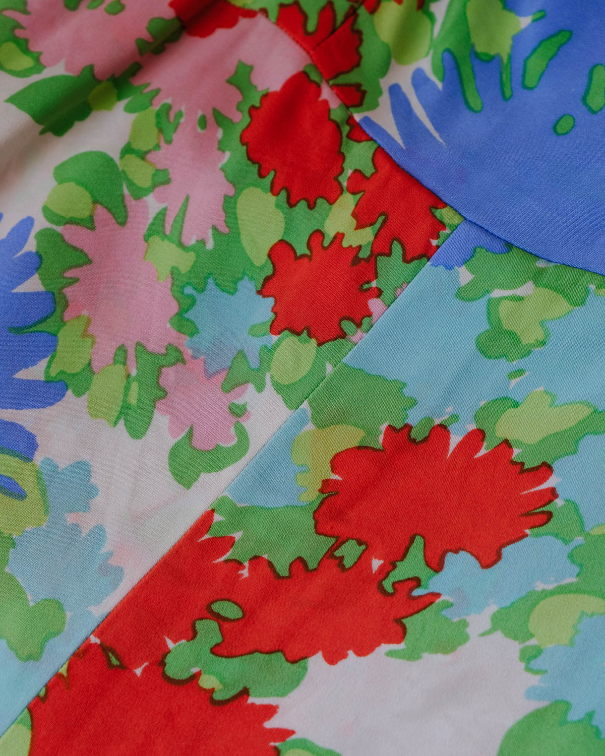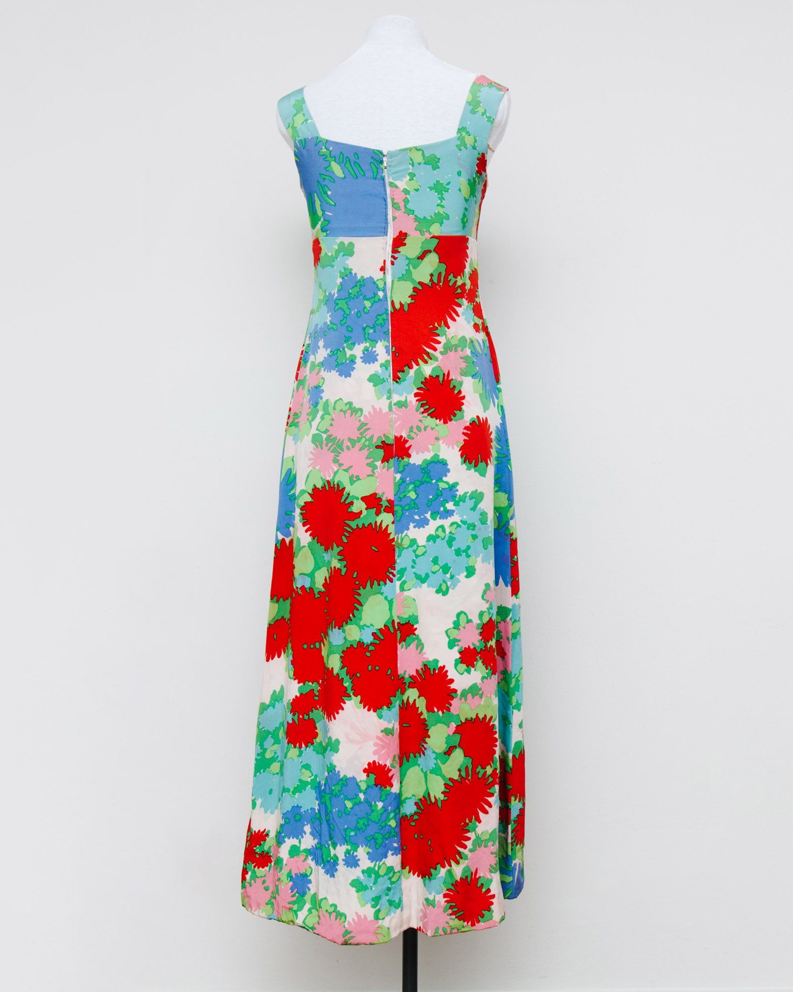 1970s Italian handmade dress, hand crafted from thick silk. The vibrant design features an abstract floral print in red, blue, green, and pink, with a sleeveless cut, square neckline, and a fitted waist that flares into a full length skirt, embodying the bold, artistic spirit of the decade.
