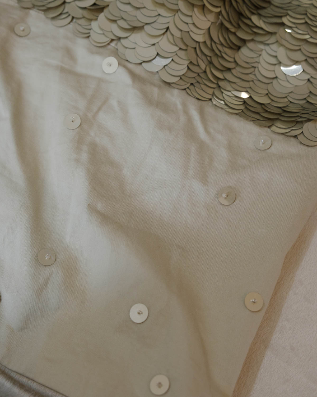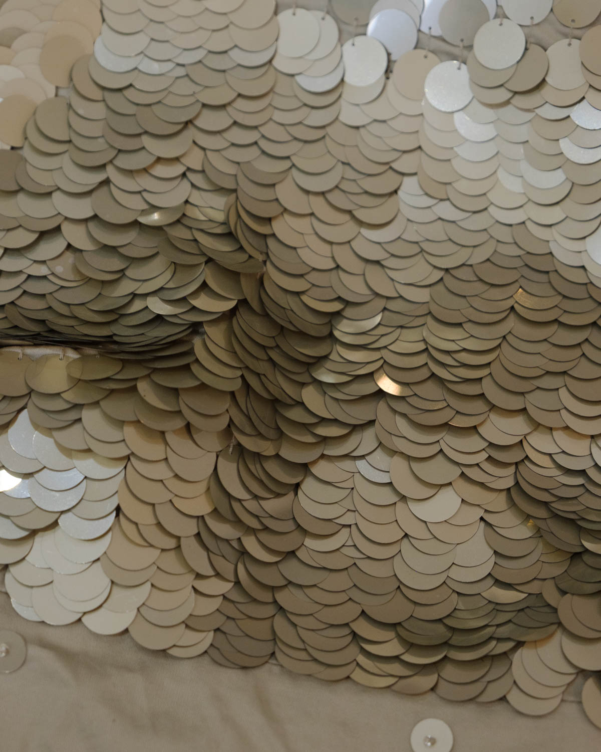 Alberta Ferretti’s dazzling sequined bustier top, crafted in Italy from a metallic cotton blend. The intricate layers of sequins create a textured, shimmering effect, while the structured silhouette and thin spaghetti straps add a modern, edgy touch.