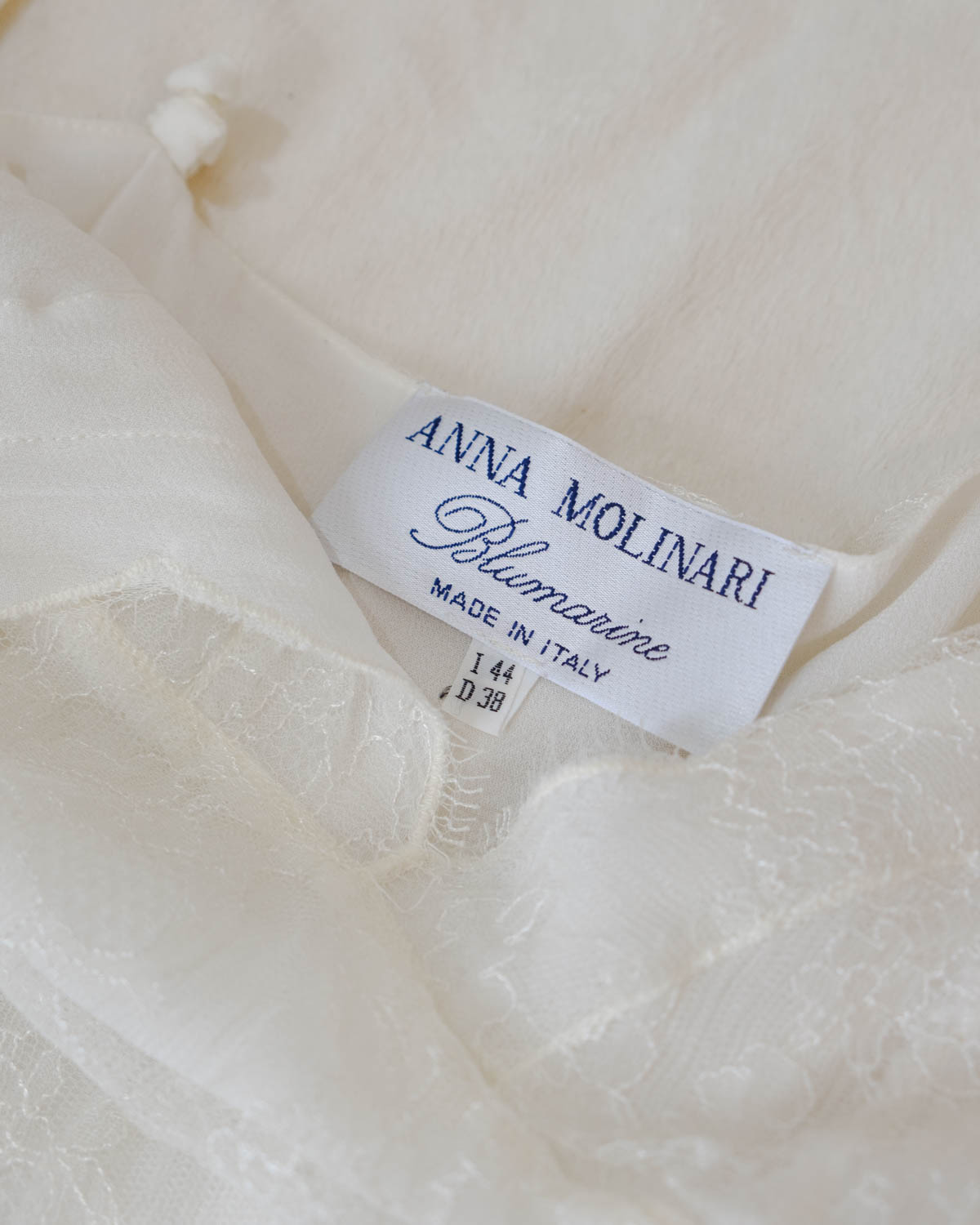 Anna Molinari’s delicate white lace camisole, featuring a V-neckline and thin straps. The intricate floral lace and soft polyamide blend create a romantic, feminine silhouette,perfect for layering or as a stand-alone statement. Fits small at the chest; consider sizing downn.