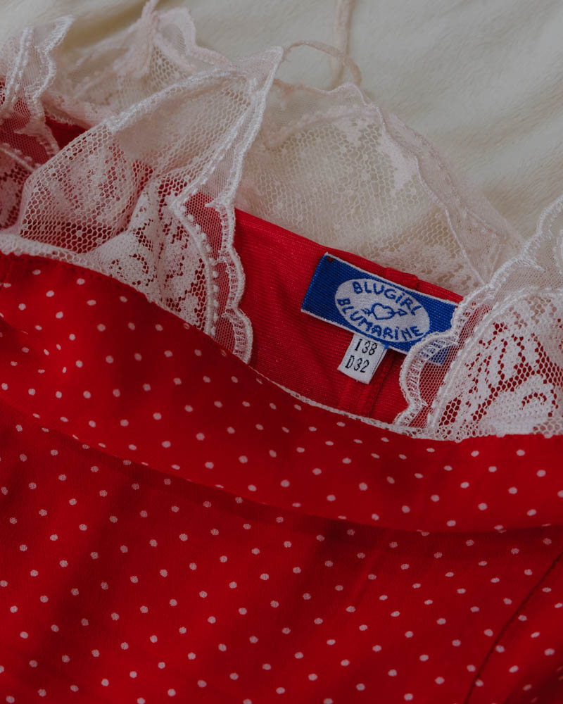 Blugirl Blumarine’s playful red silk slip dress, adorned with classic white polka dots and delicate cream lace trim. The V-neckline and flared skirt create a flirty, vintage-inspired silhouette, perfect for a romantic, coquette look.