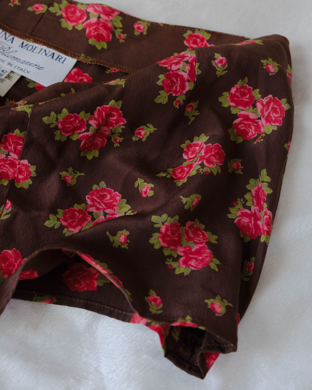 Anna Molinari Blumarine’s luxurious micro shorts, crafted from pure silk in a rich chocolate brown. The vibrant floral rose print in pinks and greens adds a playful, feminine touch. Perfect for a bold, vintage-inspired statement. Caution, these are micro