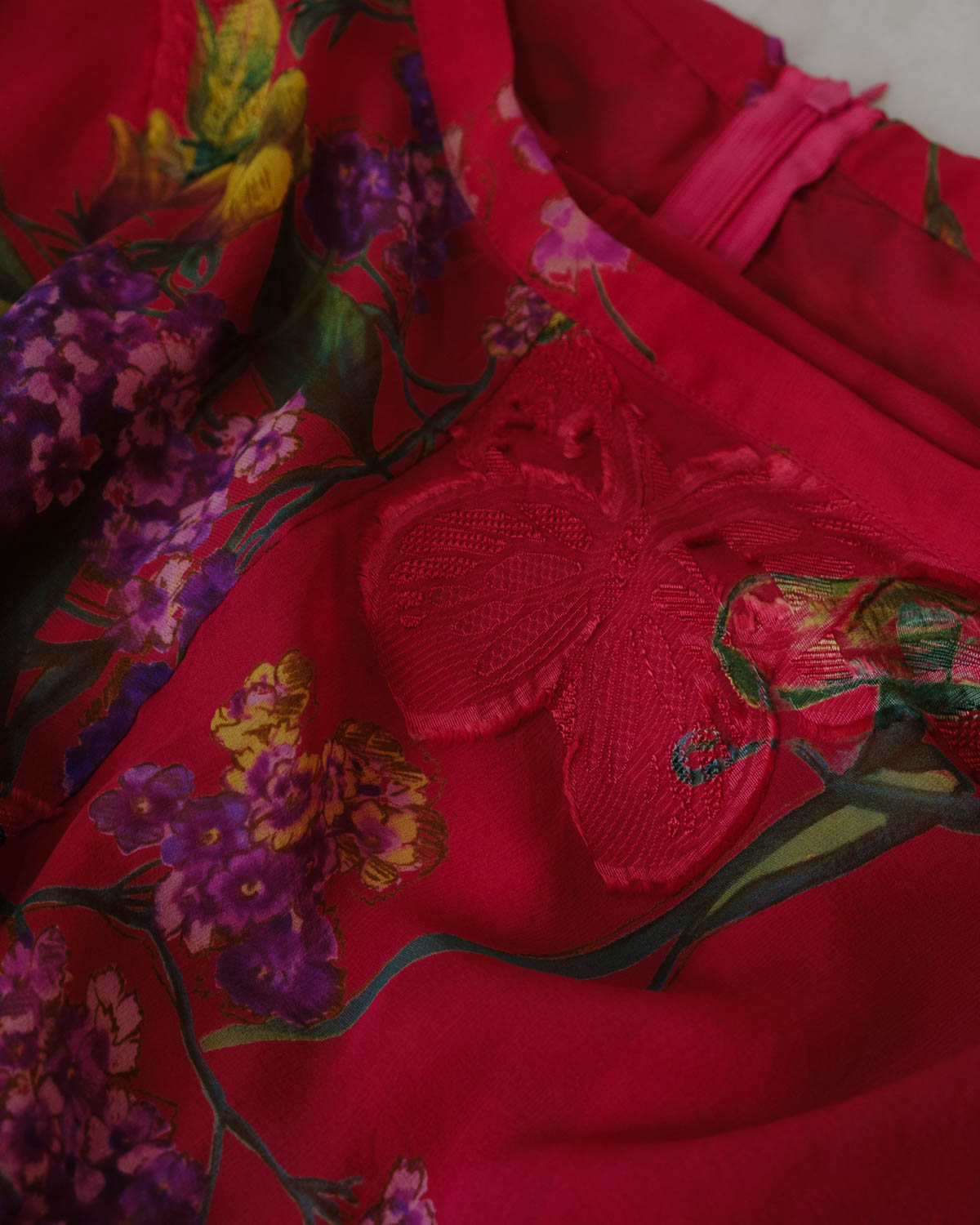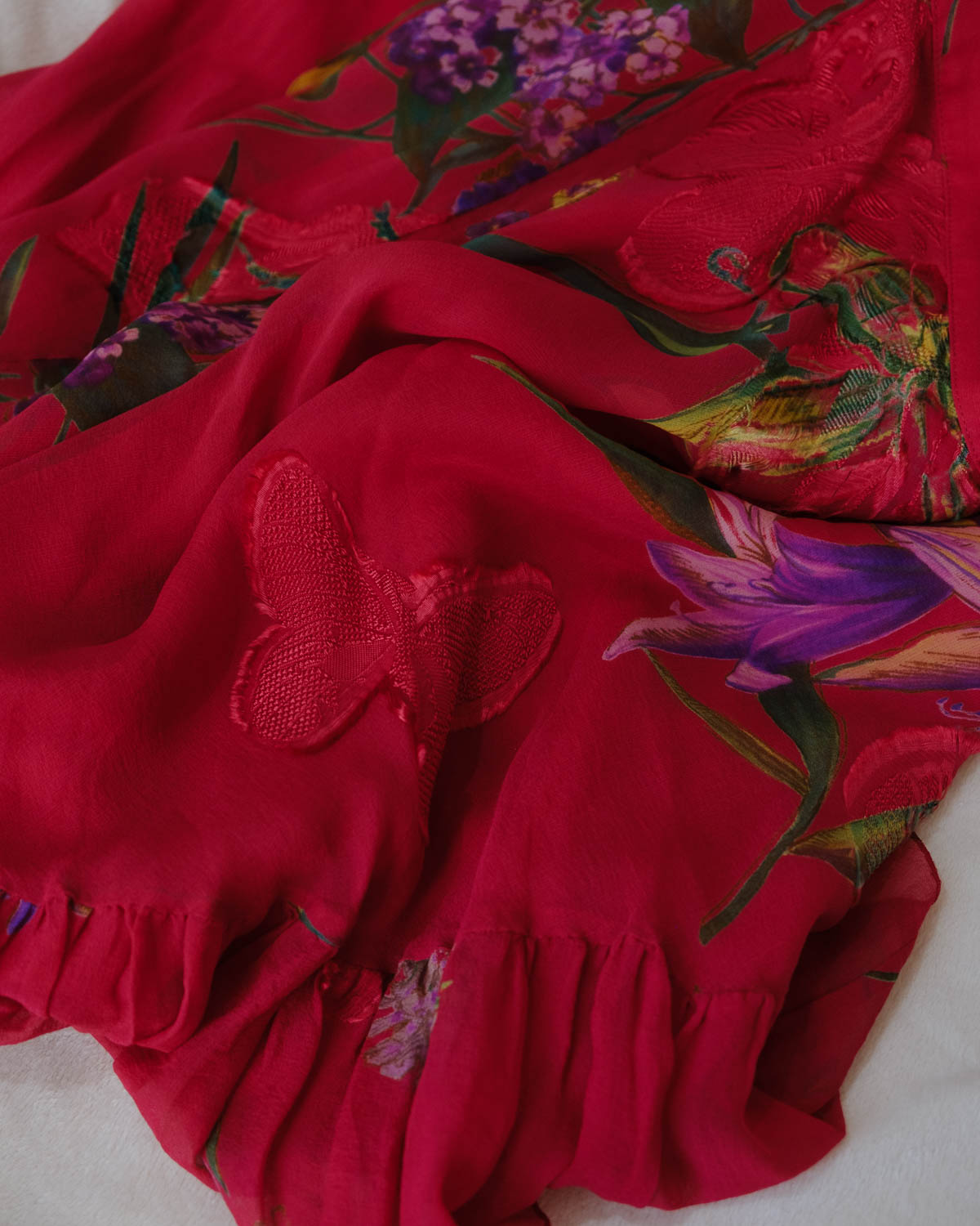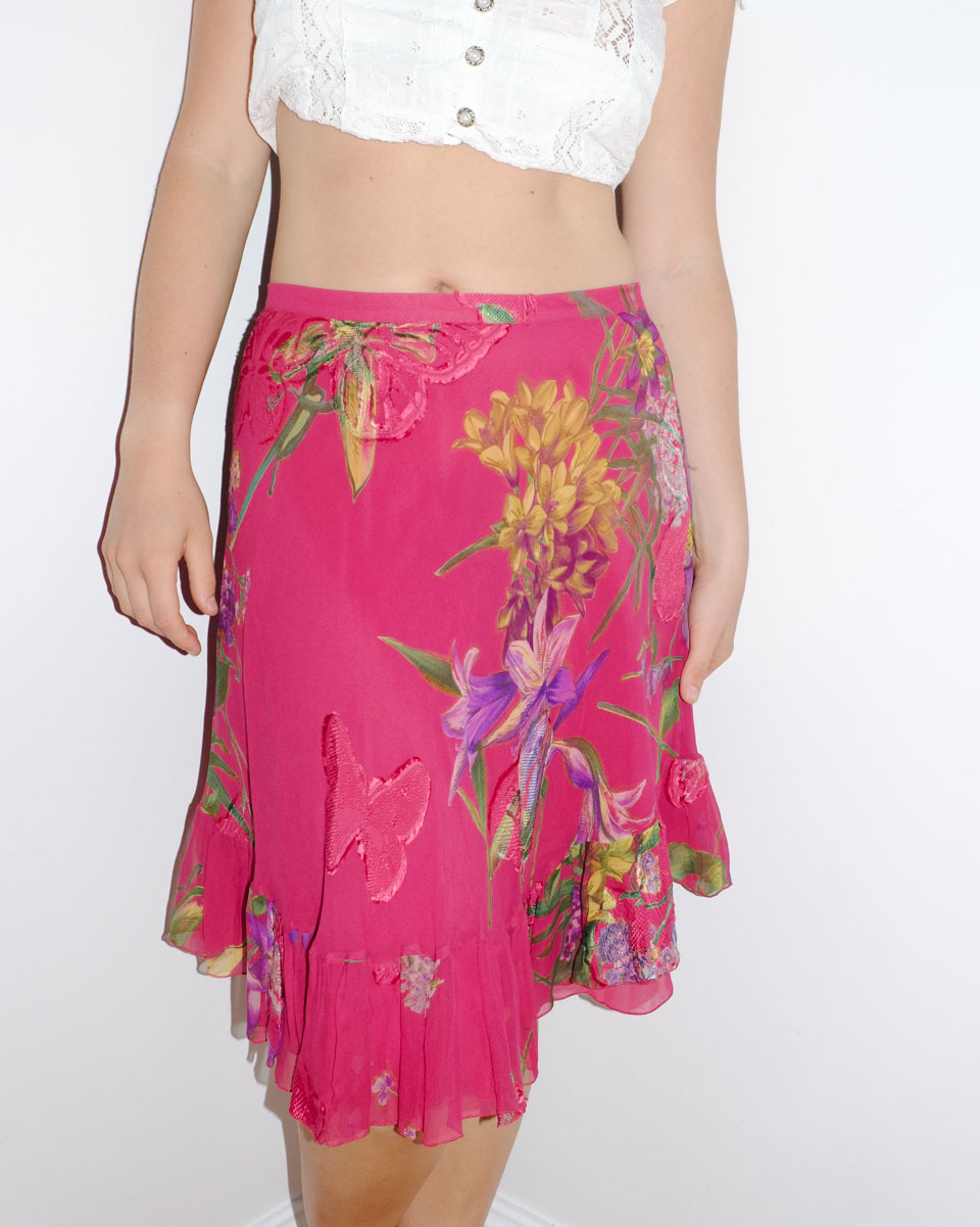 Blumarine’s silk midi skirt in deep pink, adorned with lush floral and botanical prints. The 2000s mid waist design and asymmetrical ruffled hem create a romantic silhouette, perfect for a feminine statement.