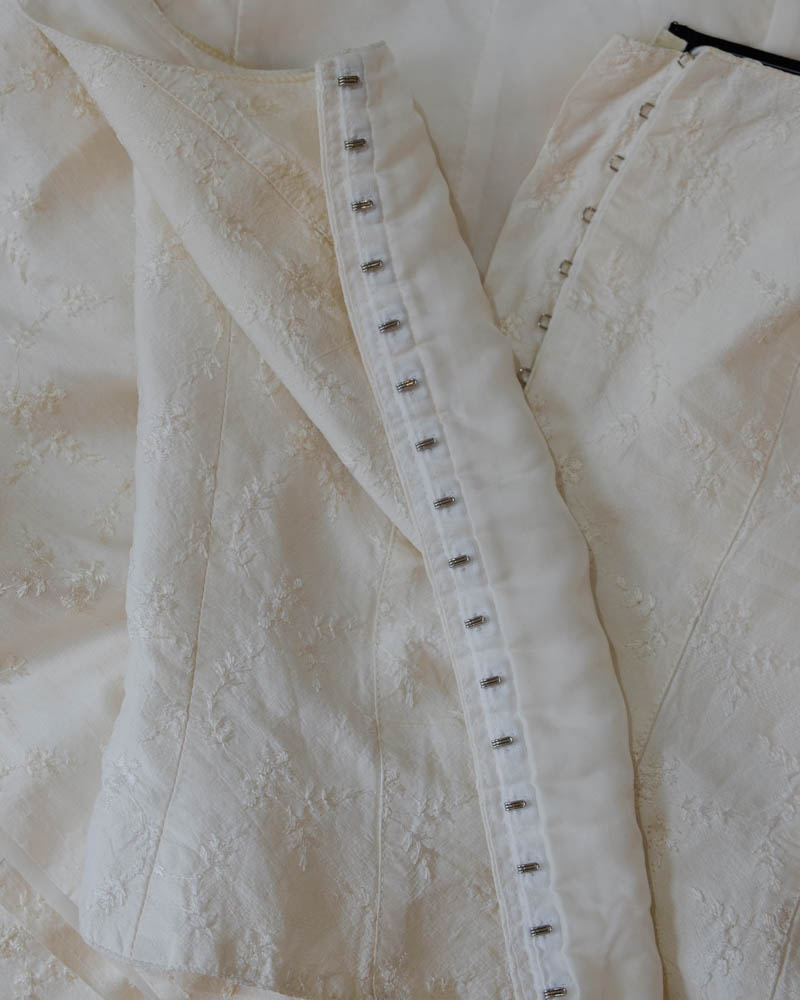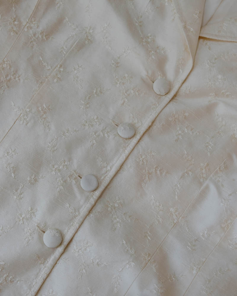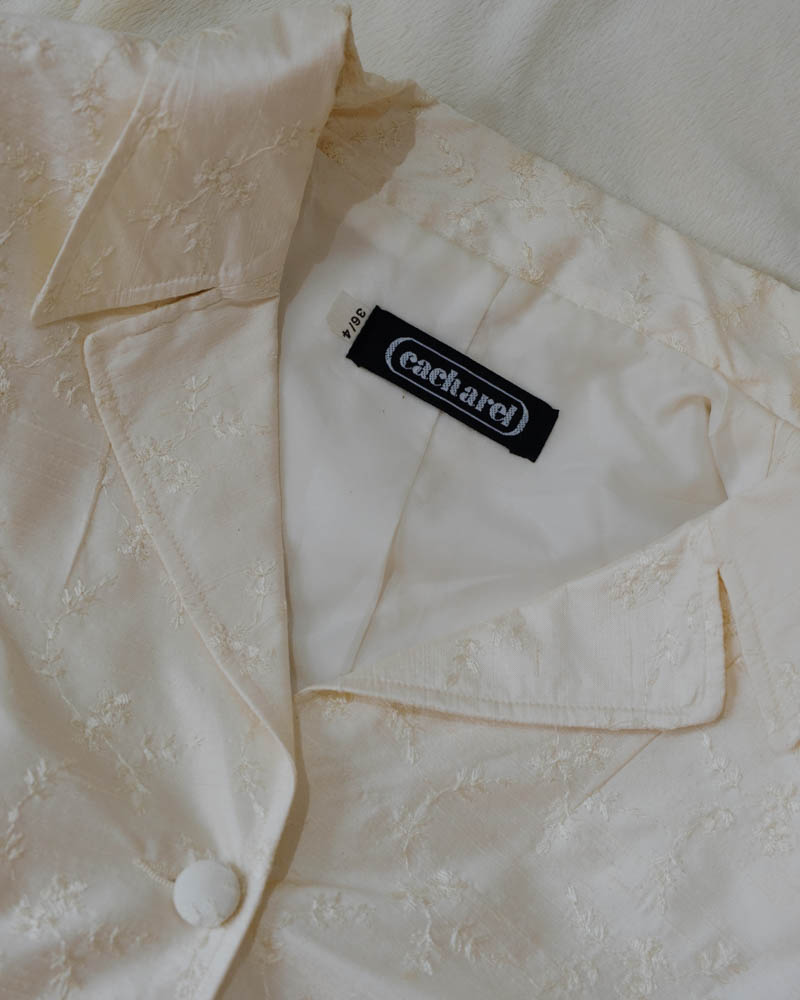 Cacharel’s elegant white silk jacquard set, featuring a structured blazer with notched lapels, a sleeveless corset top, and a high-waisted pencil skirt. The intricate jacquard pattern and tailored fit create a sophisticated, timeless silhouette.