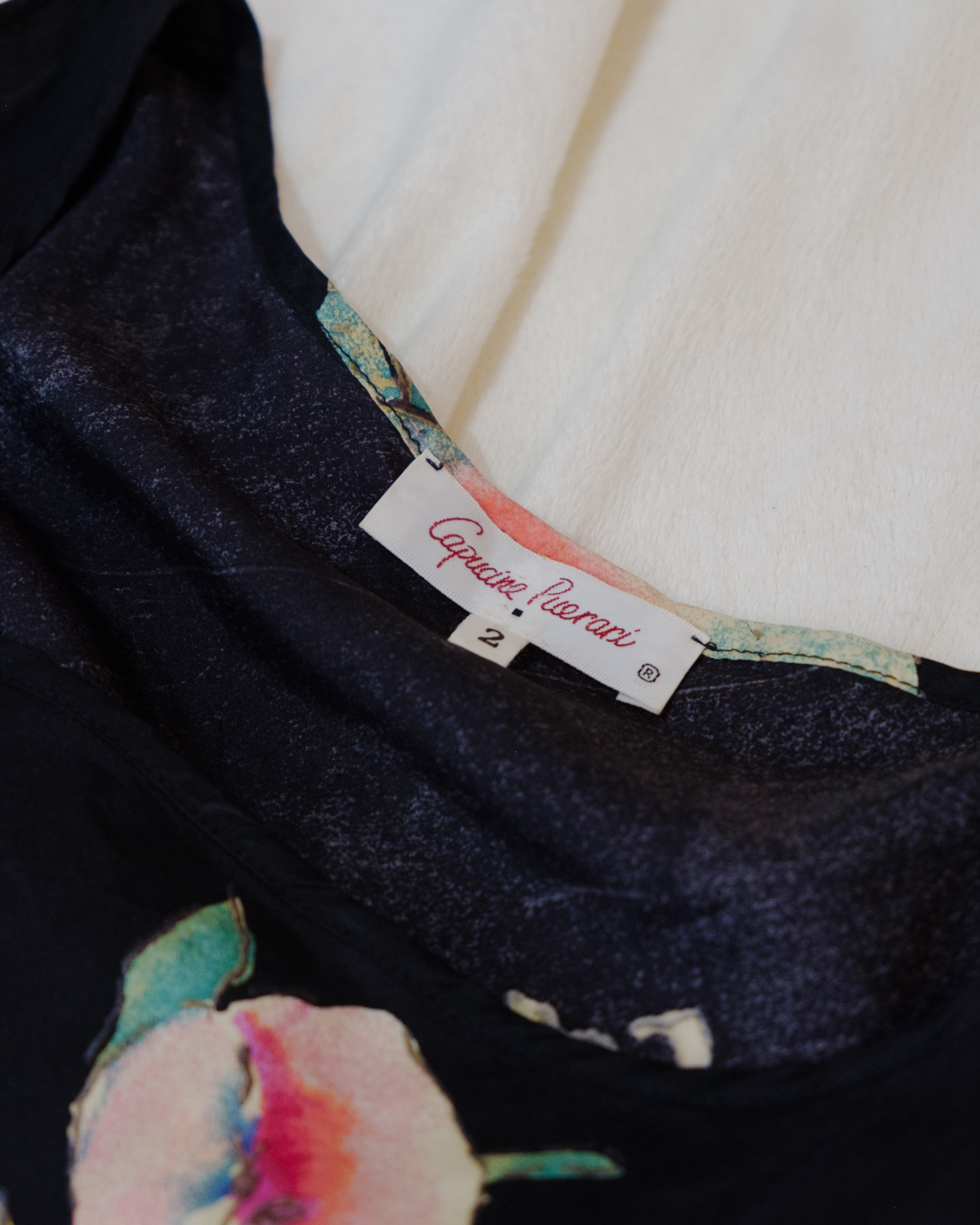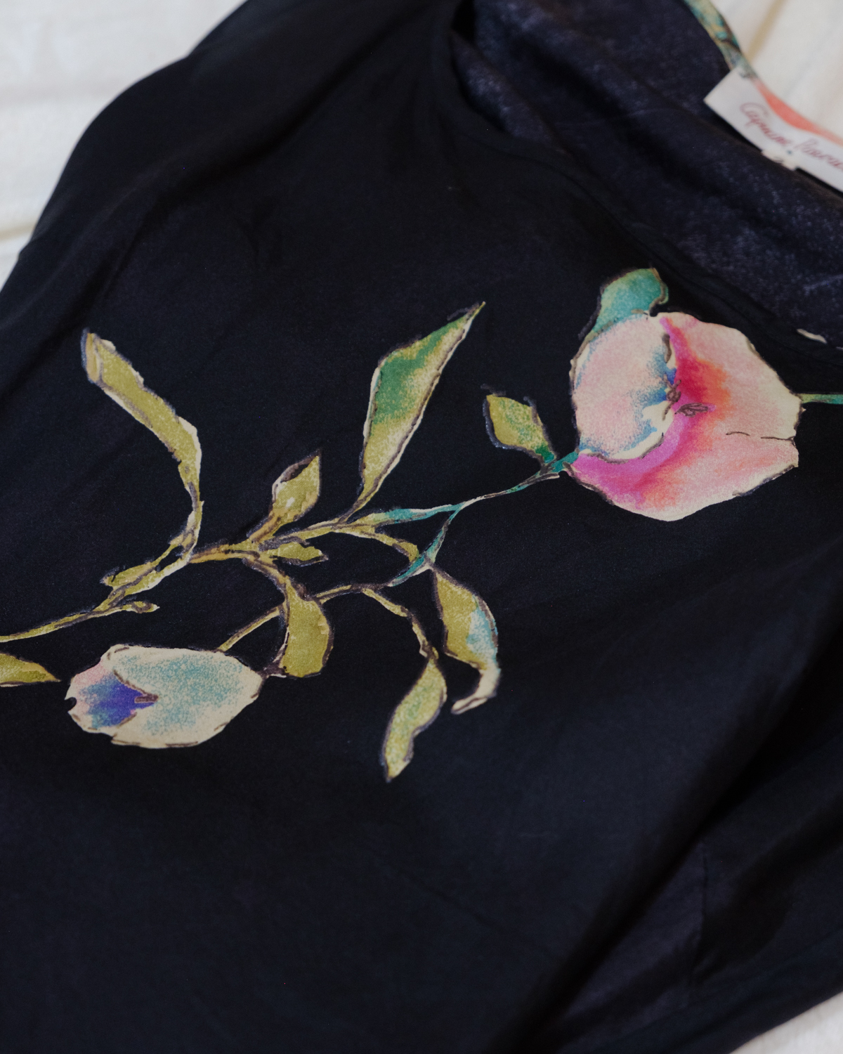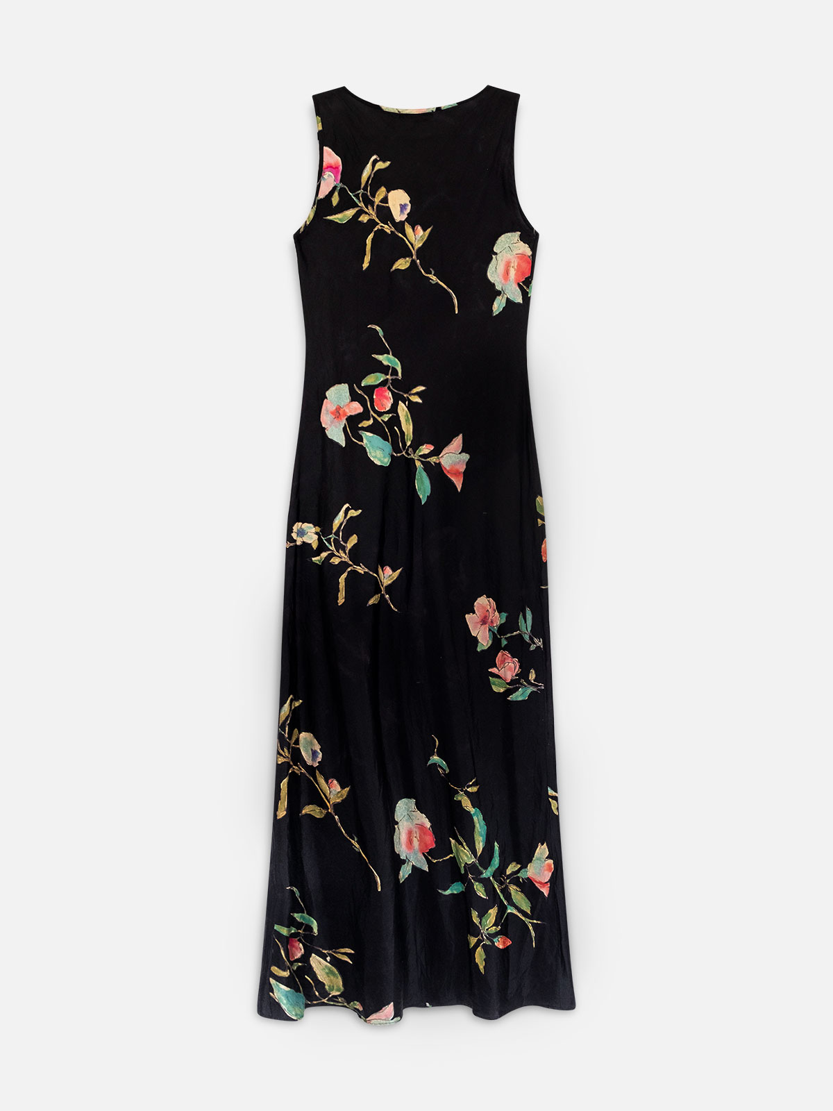 Capucine Puerari’s breathtaking hand-painted style silk slip dress, a true work of art. The deep black base is adorned with delicate, vibrant roses and foliage, designed to look hand painted. The lightweight silk create an effortlessly elegant silhouette.