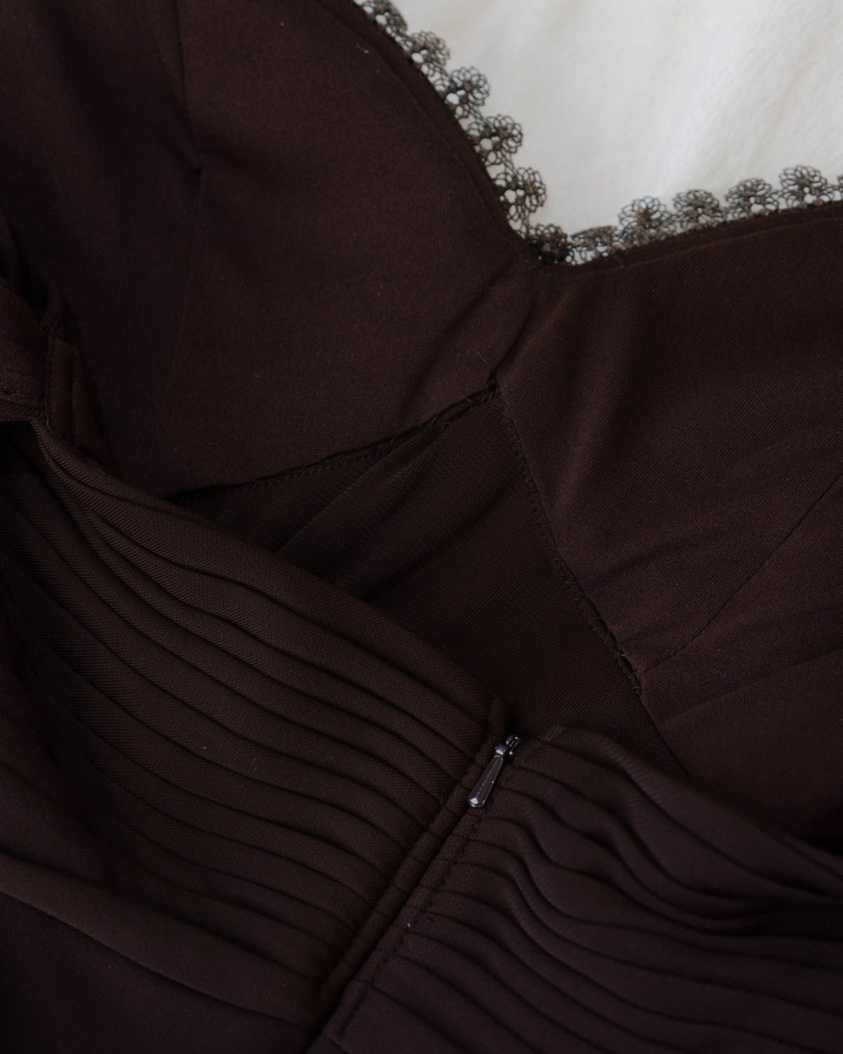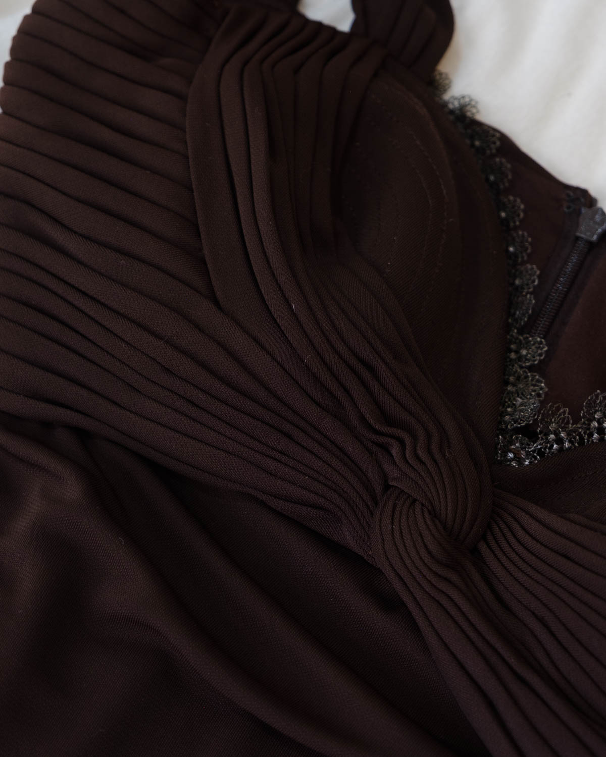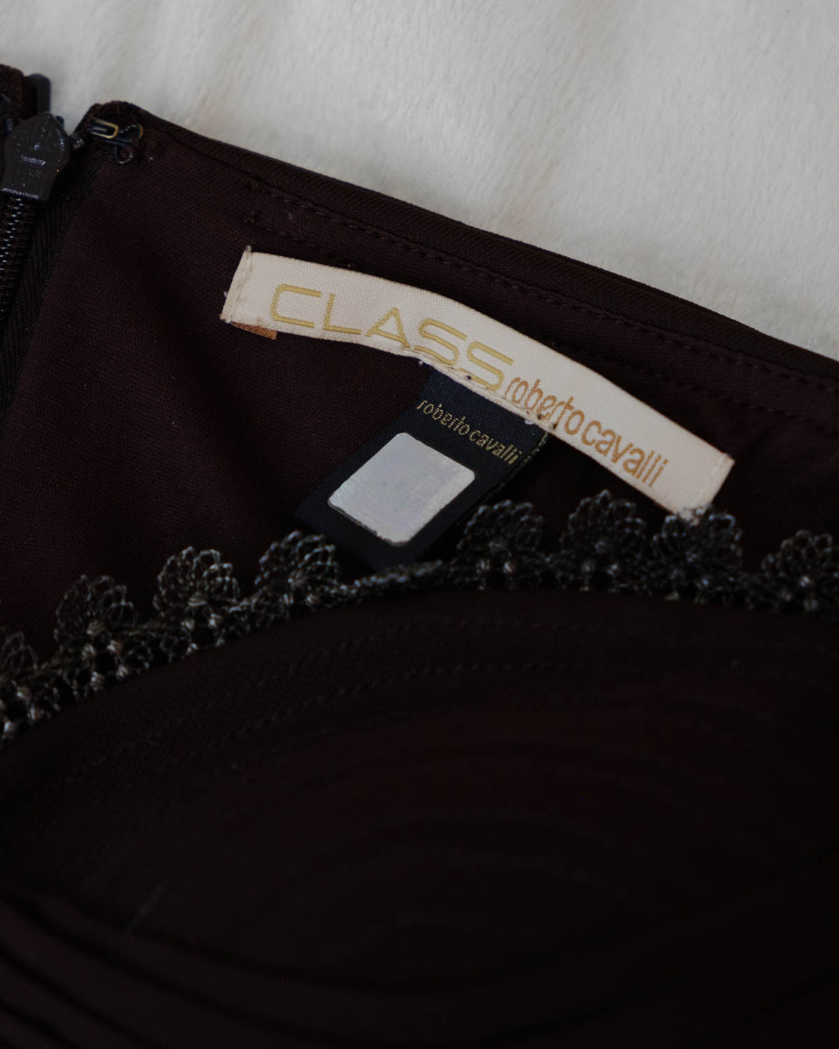 Class by Roberto Cavalli’s sophisticated midi dress exudes understated glamour. The deep brown synthetic blend features intricate pleating at the bust, with built-in padding to ensure the most flattering silhouette. The romantic shape skims over the curves before flaring gracefully at the hem.