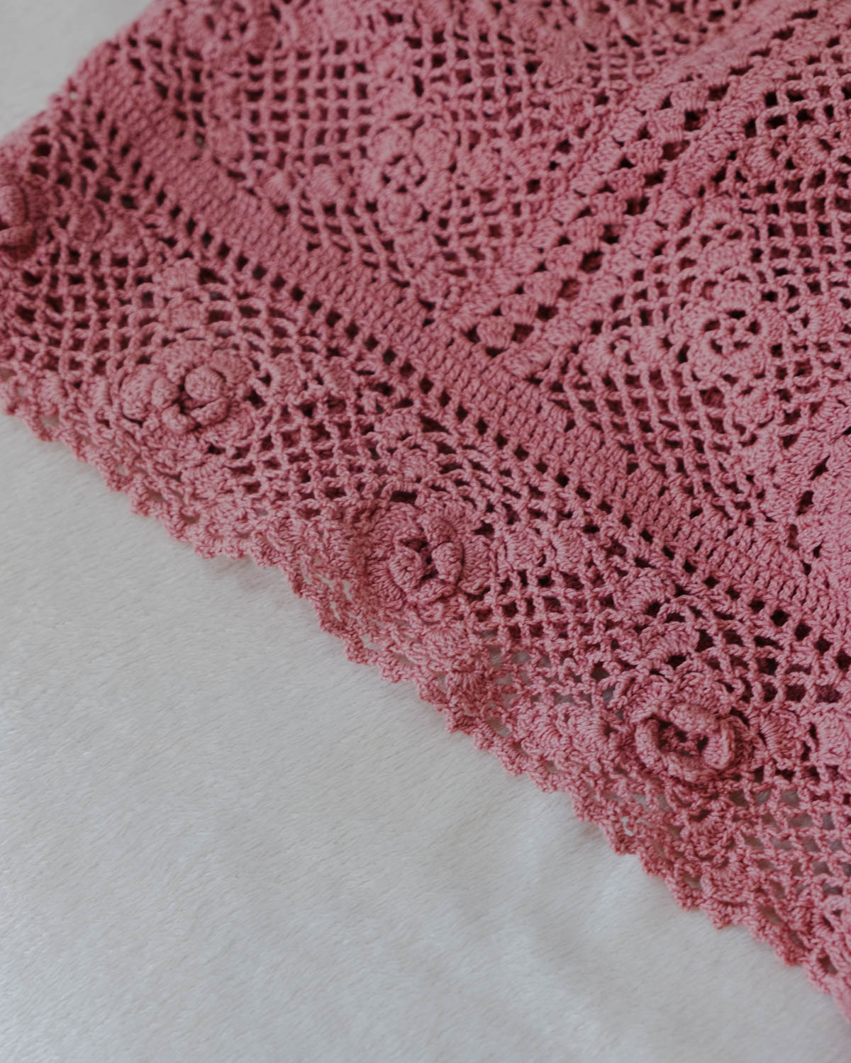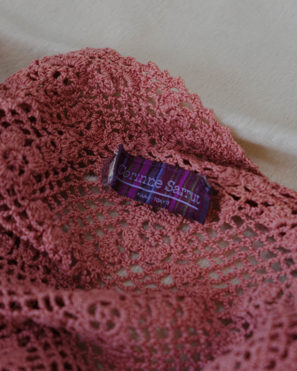 Corinne Sarrut’s charming crochet top in soft rose, featuring intricate openwork and a classic collared neckline. The lightweight cotton and short sleeves offer a vintage-inspired, boho-chic look. Perfect for layering or wearing alone.