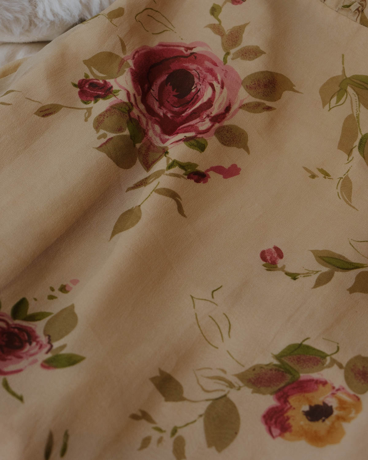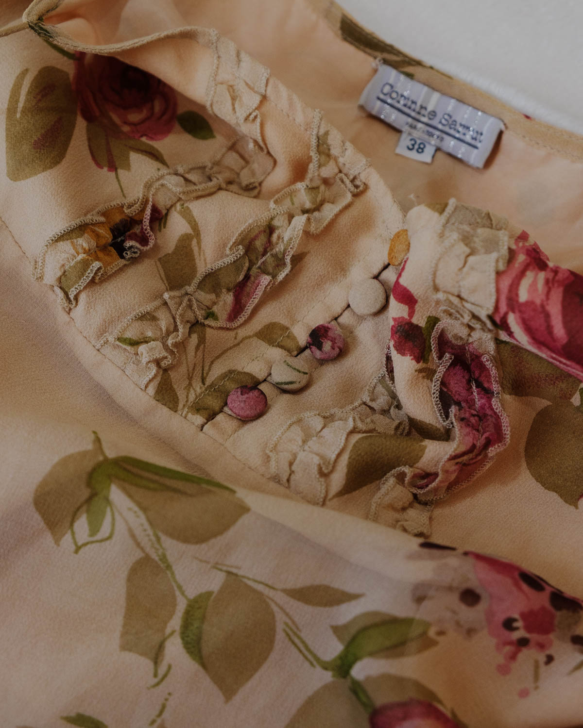 Corinne Sarrut’s silk slip dress is french effortless elegance. The beige base is adorned with romantic floral prints in soft pinks and greens, while delicate lace trim graces the hem and neckline. Fitted through the bust and skimming straight down, the luxurious silk drapes beautifully, hugging your curves for a timeless, feminine silhouette.