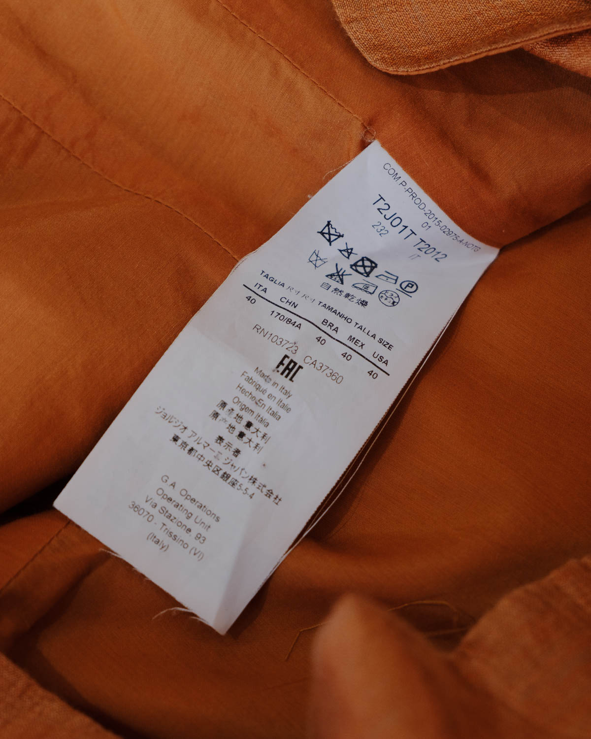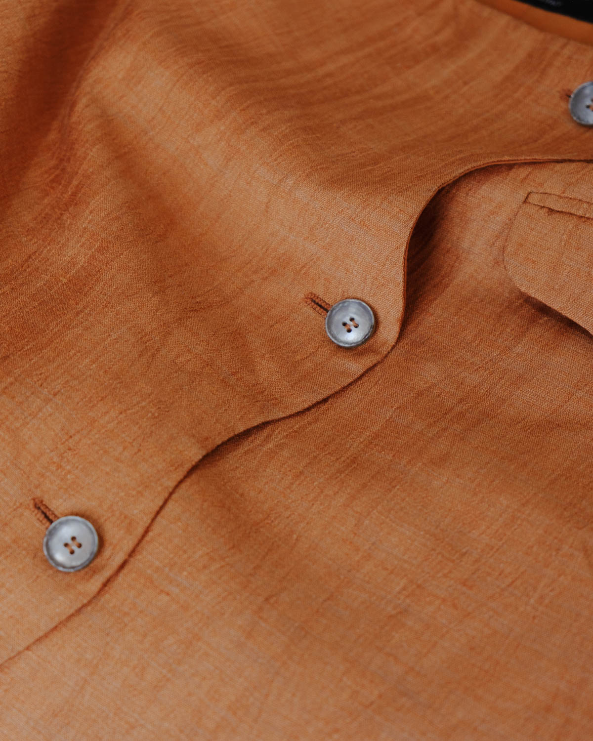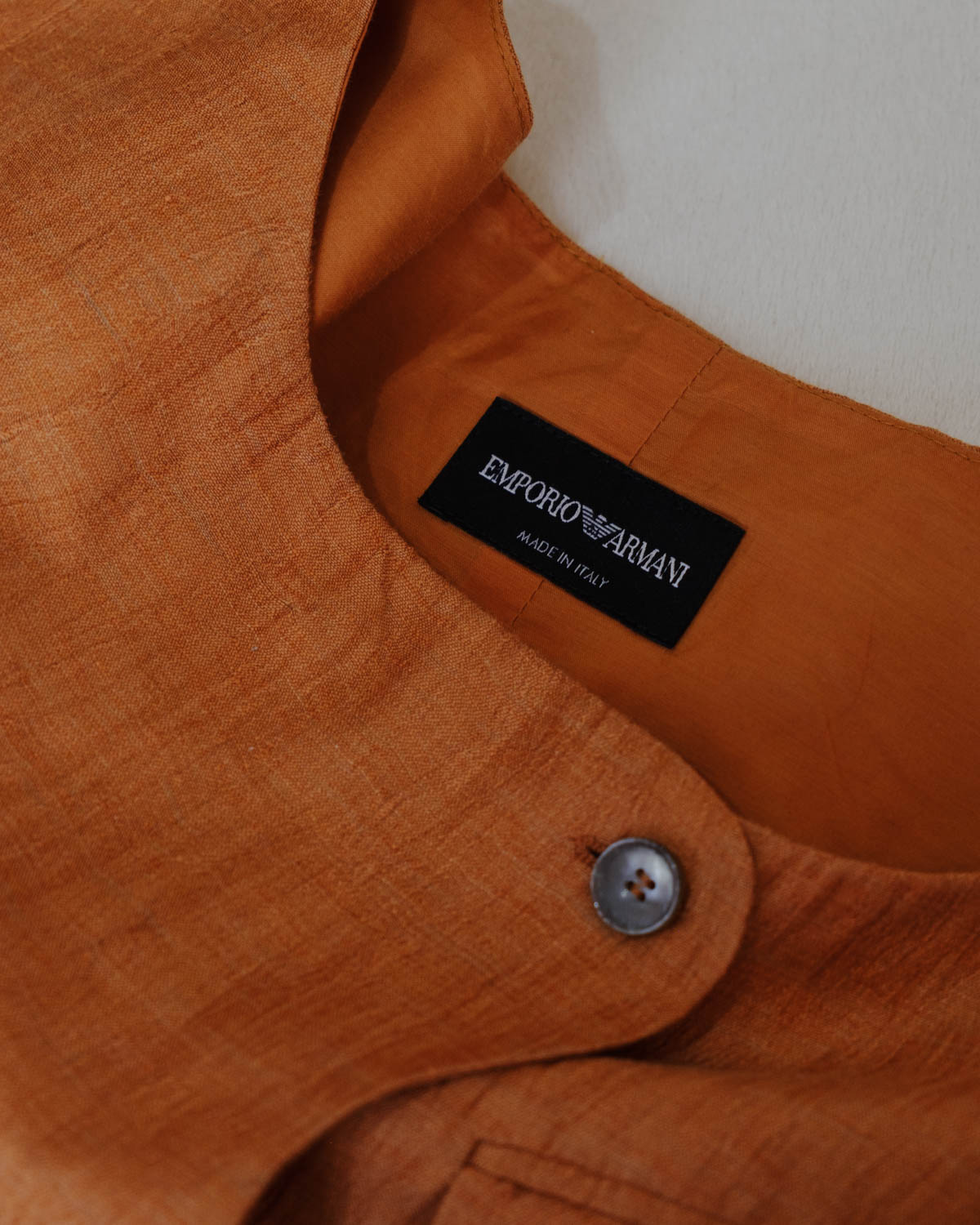 Emporio Armani’s burnt orange linen-blend vest style top, featuring a unique wave edge detail at the front.. The structured round neckline, button-front closure, and chest pocket detail create a polished, minimalist silhouette.