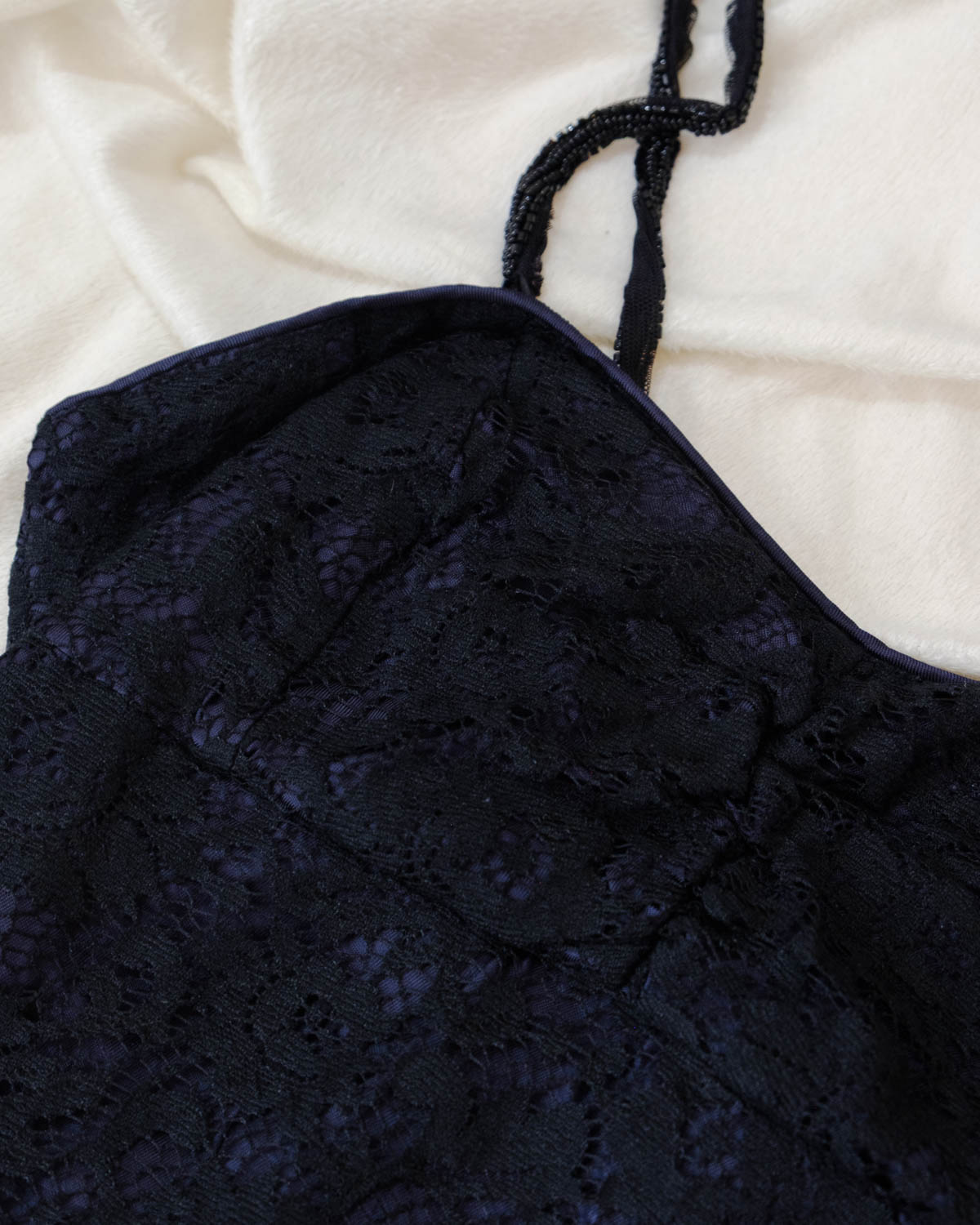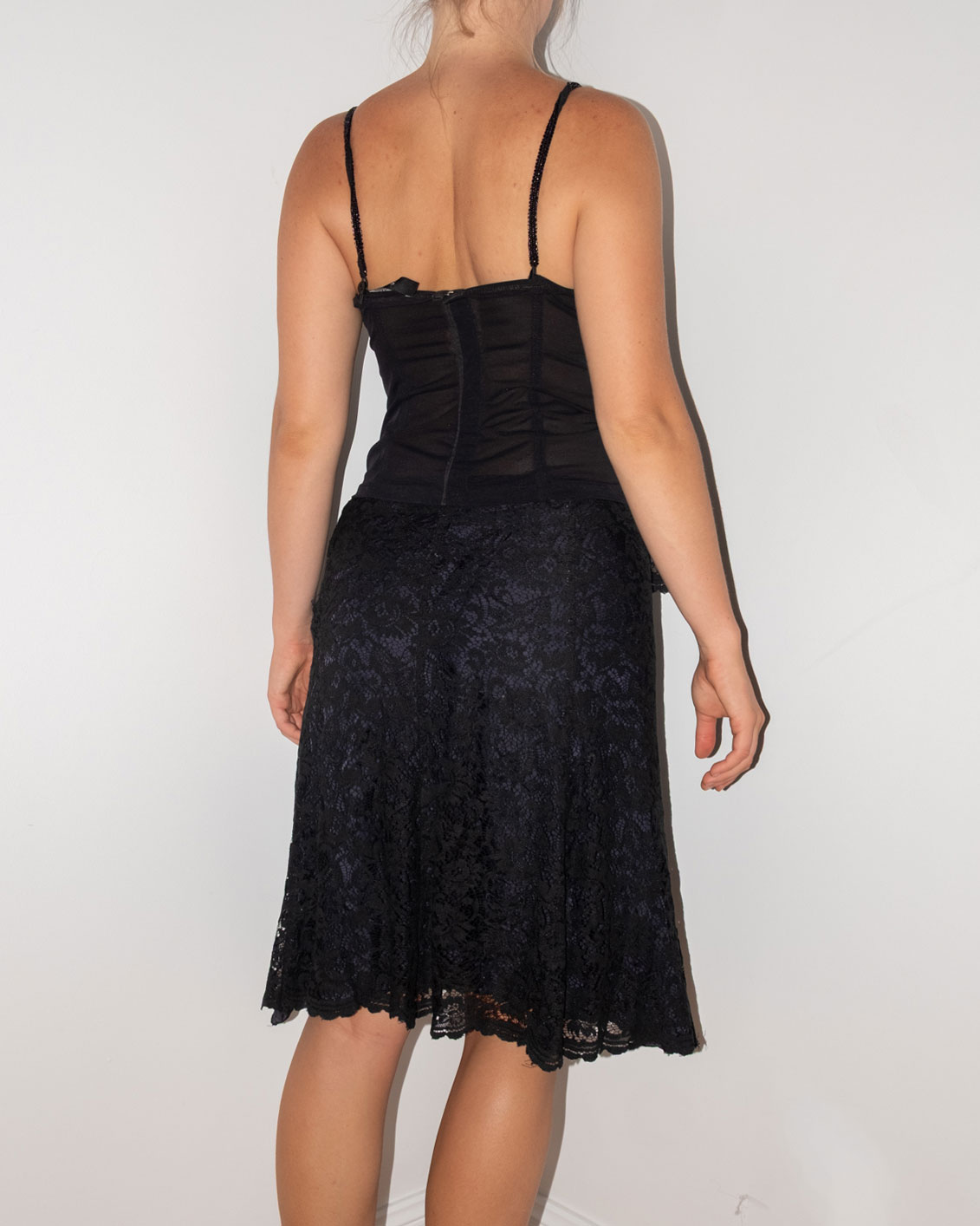 SottoMarino’s lace two-piece set, crafted in Italy from black/navy blue lace fabric. The top features a scalloped hem, beaded straps, and a mesh back with a corset-style hook-and-eye closure. The flared midi skirt includes a scalloped edge.
