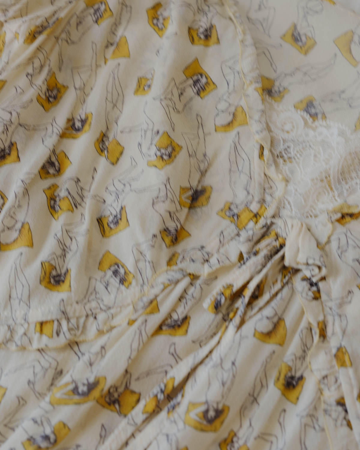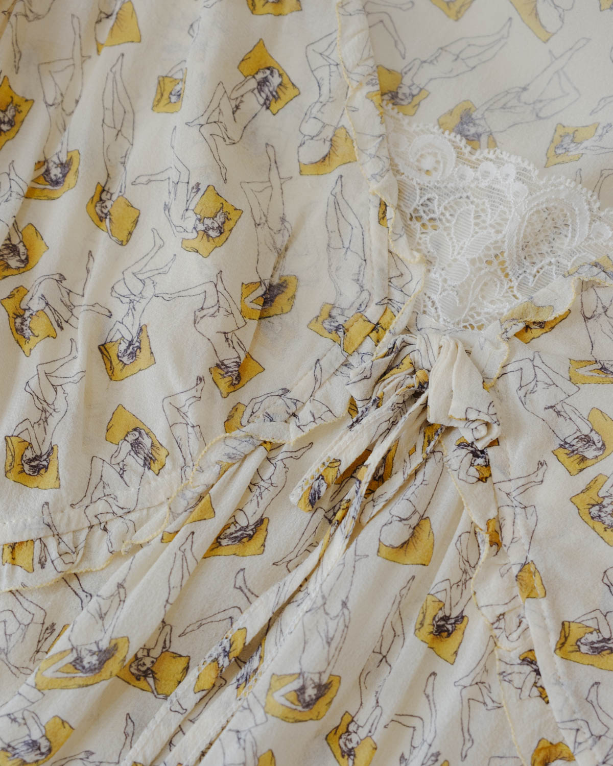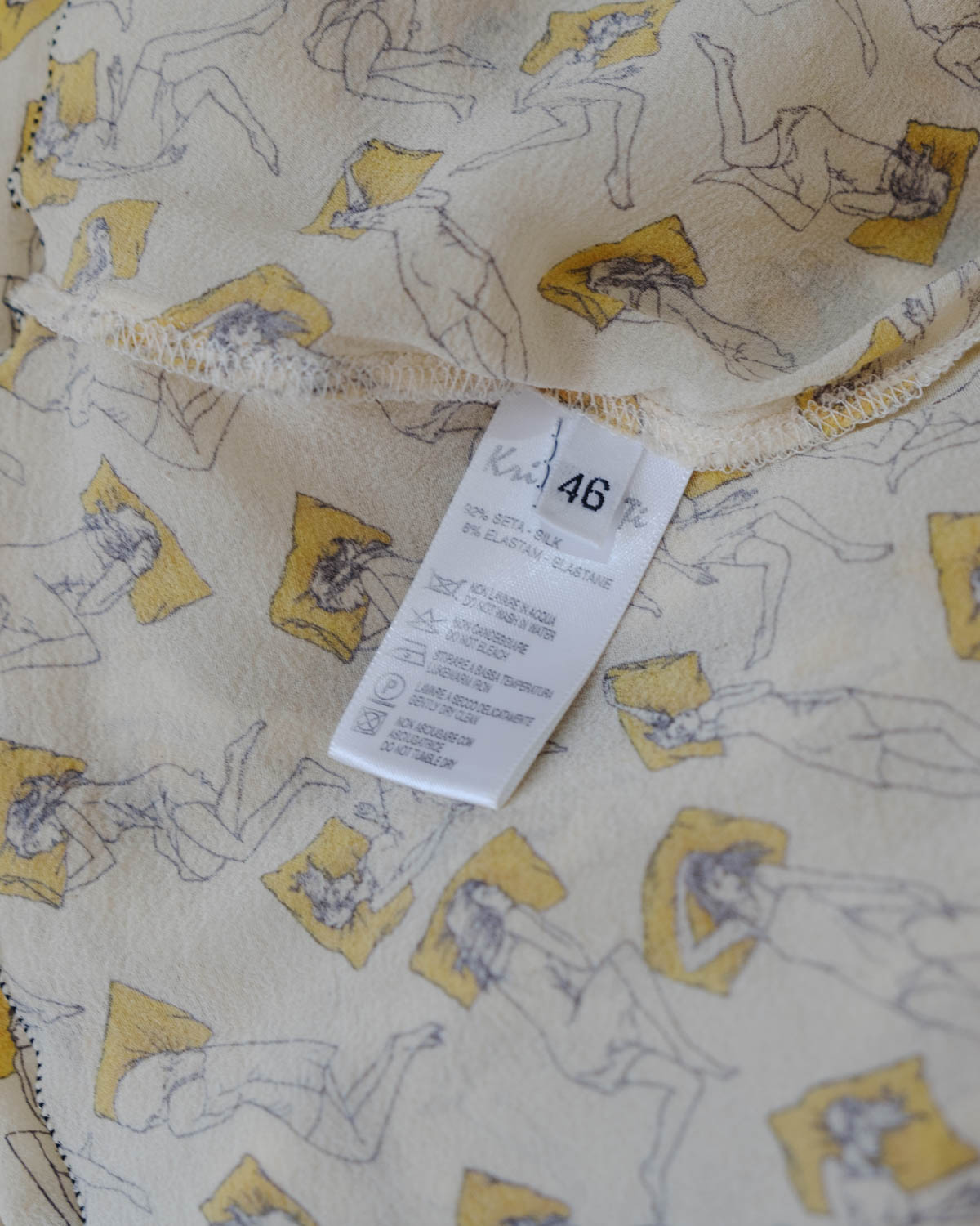 Kristina Ti’s abstract print blouse, crafted in Italy from silk. The cream top features a unique all-over print of sleeping women and geometric shapes, with short ruffled sleeves and a tie detail at the waist, creating a dreamy, artistic look.