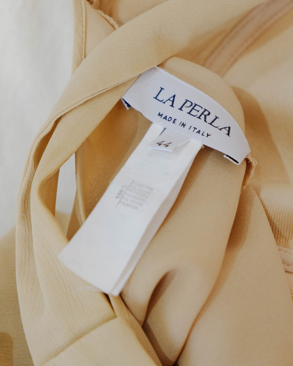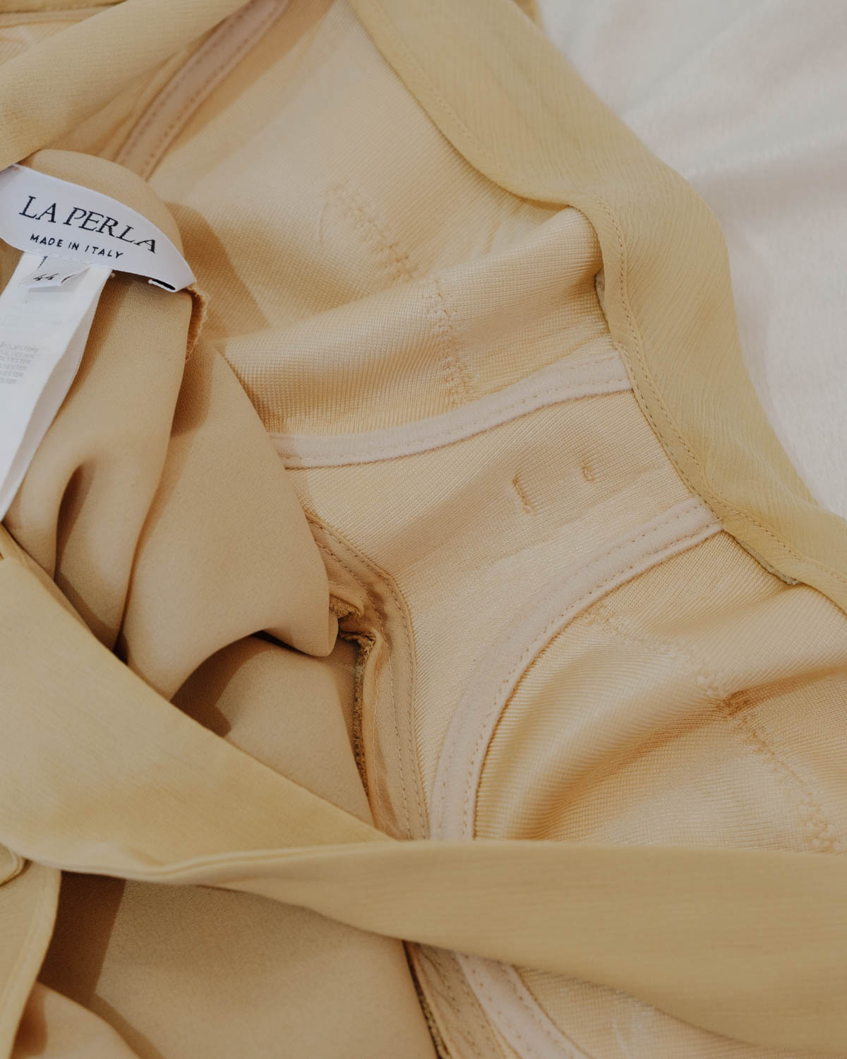 La Perla’s timeless nude halter-neck maxi dress gown including built in bra, a La Perla signature. The draped bodice and flowing, floor-length skirt create a graceful, romantic silhouette. Ideal for special occasions or refined evenings.