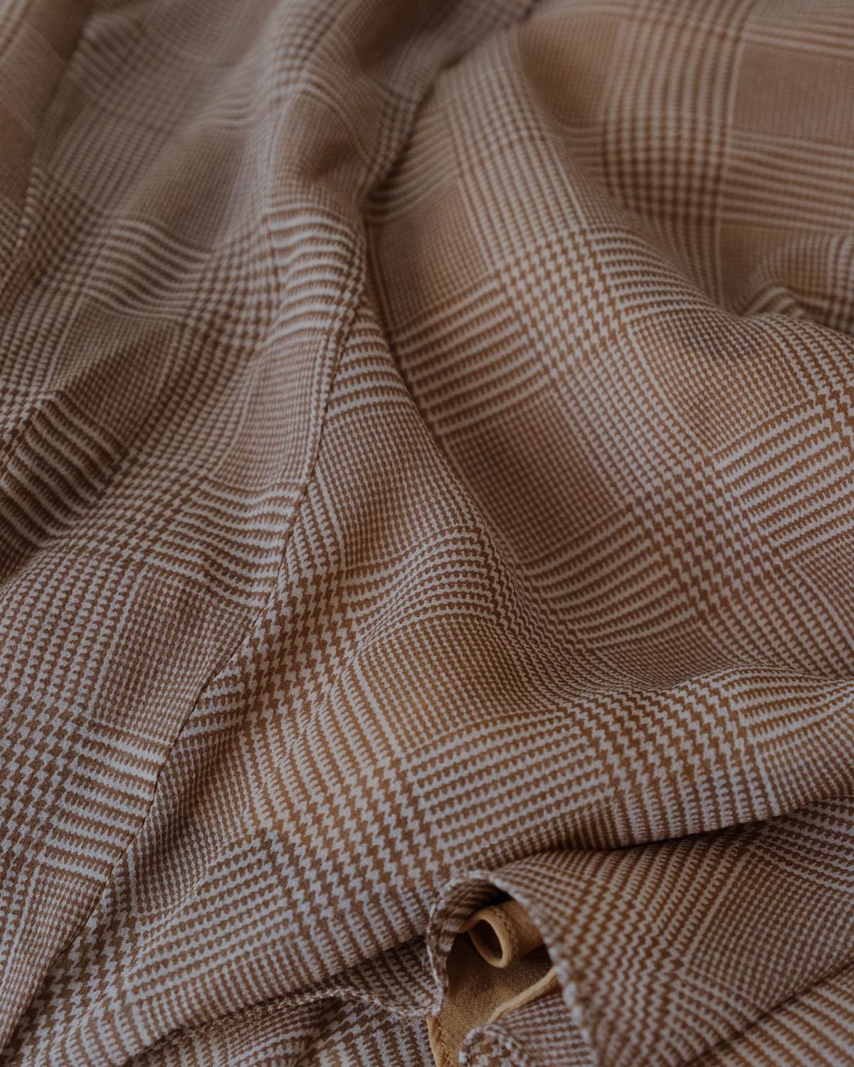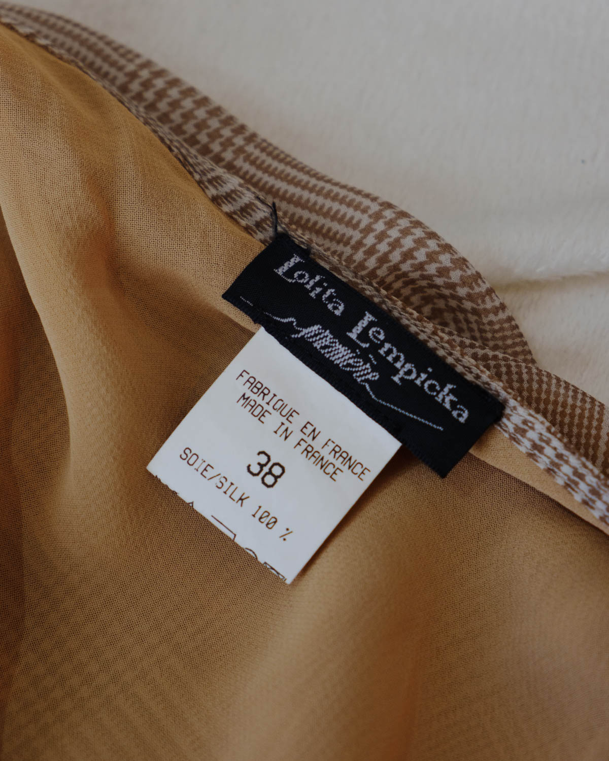 Lolita Lempicka’s beige houndstooth skirt, crafted in France from silk. The windowpane houndstooth print adds a classic touch, while the asymmetrical drape and fluid silhouette create a flirty look.