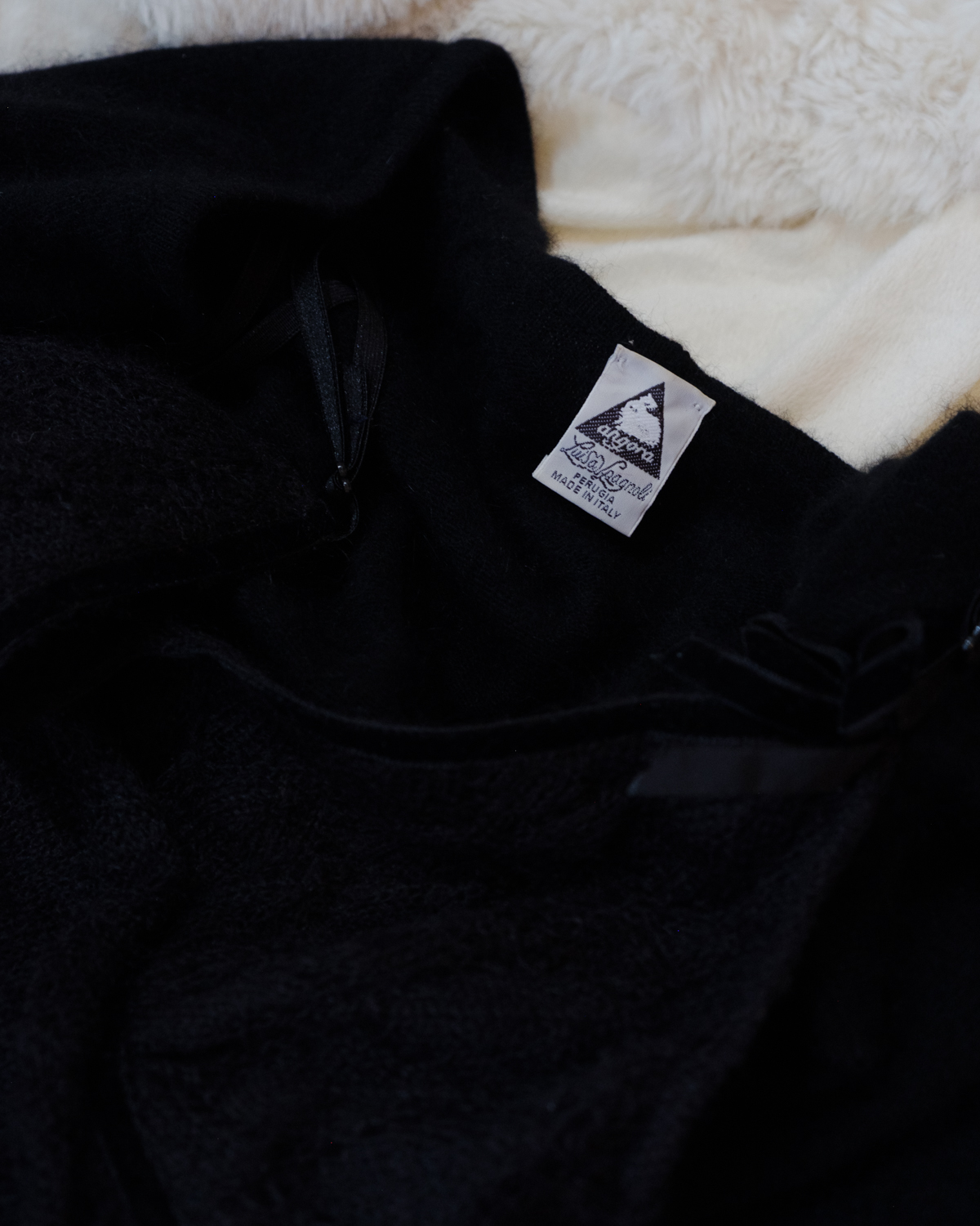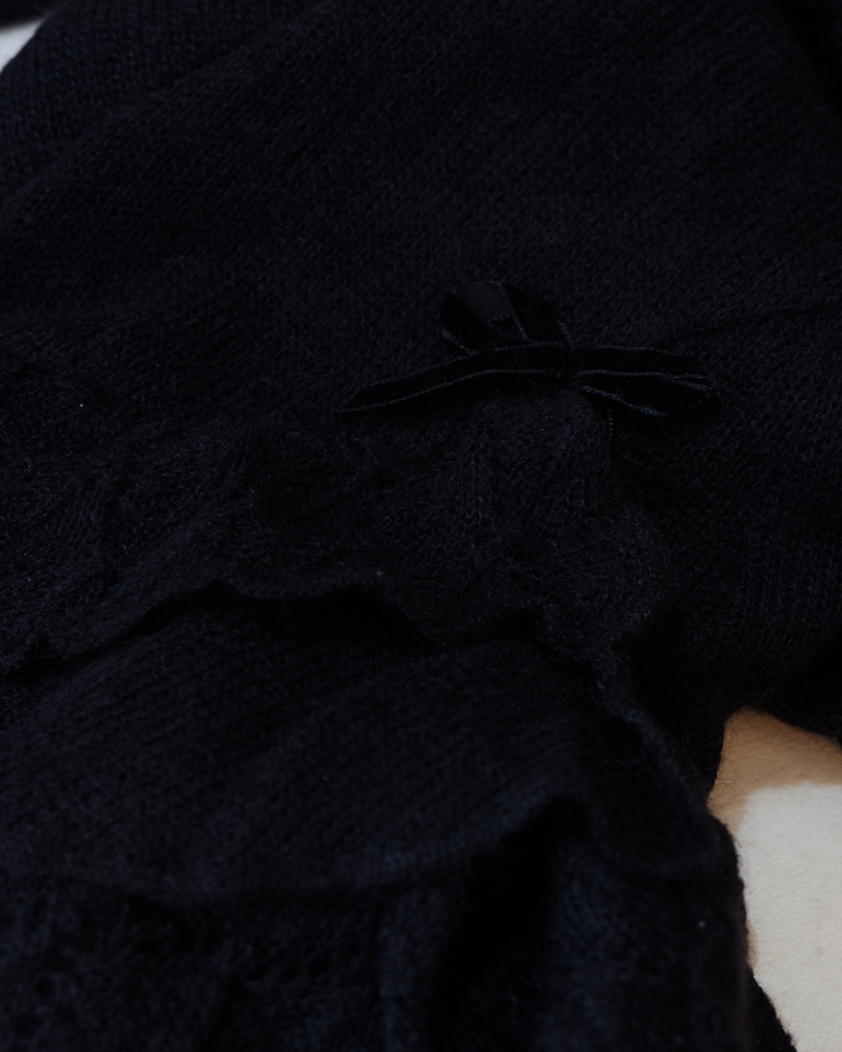 Luisa Spagnoli’s classic black mohair dress and bolero cardigan set. The fitted dress features a flattering V-neckline, tiered ruffle hem, and delicate bow detail, while the matching 3/4 sleeve cardigan is the perfect layering piece to add a touch of romance.