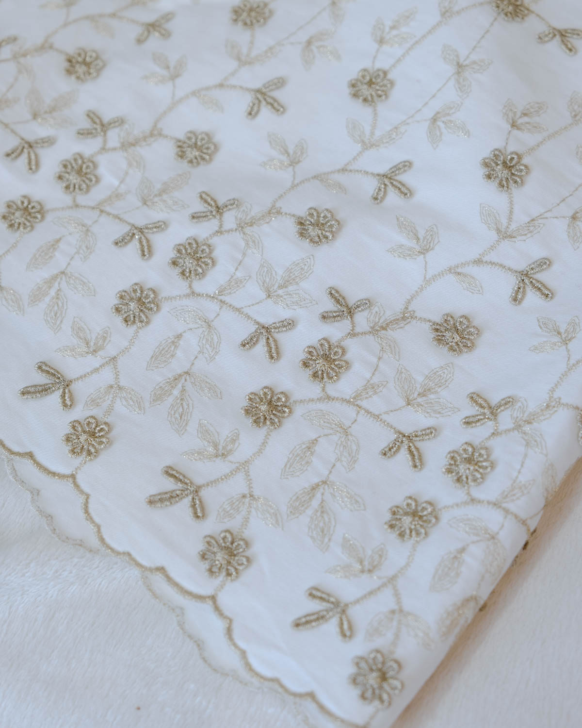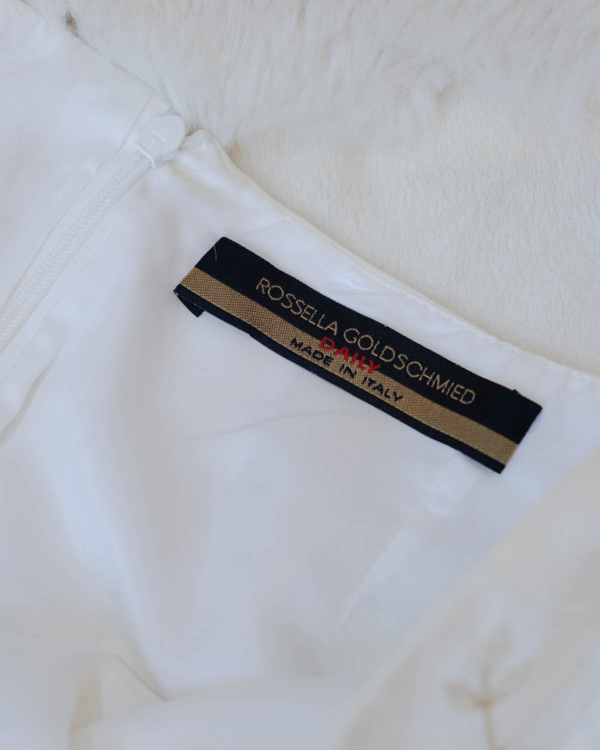 Rosella Goldschmied’s vintage-inspired cotton skirt in crisp white, adorned with delicate metallic floral embroidery. The scalloped hem and lightweight fabric create a whimsical, romantic look—perfect for a dreamy, feminine aesthetic.