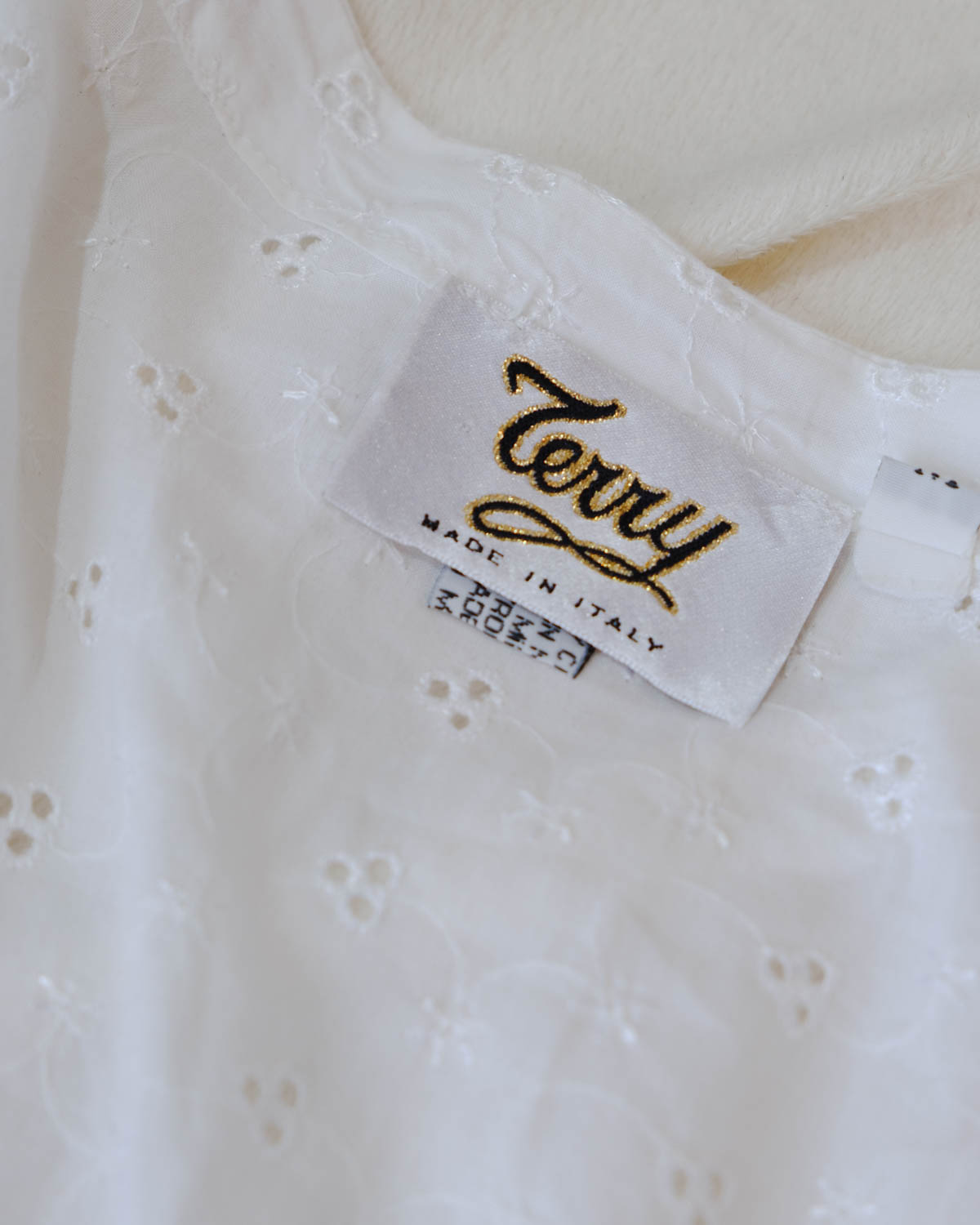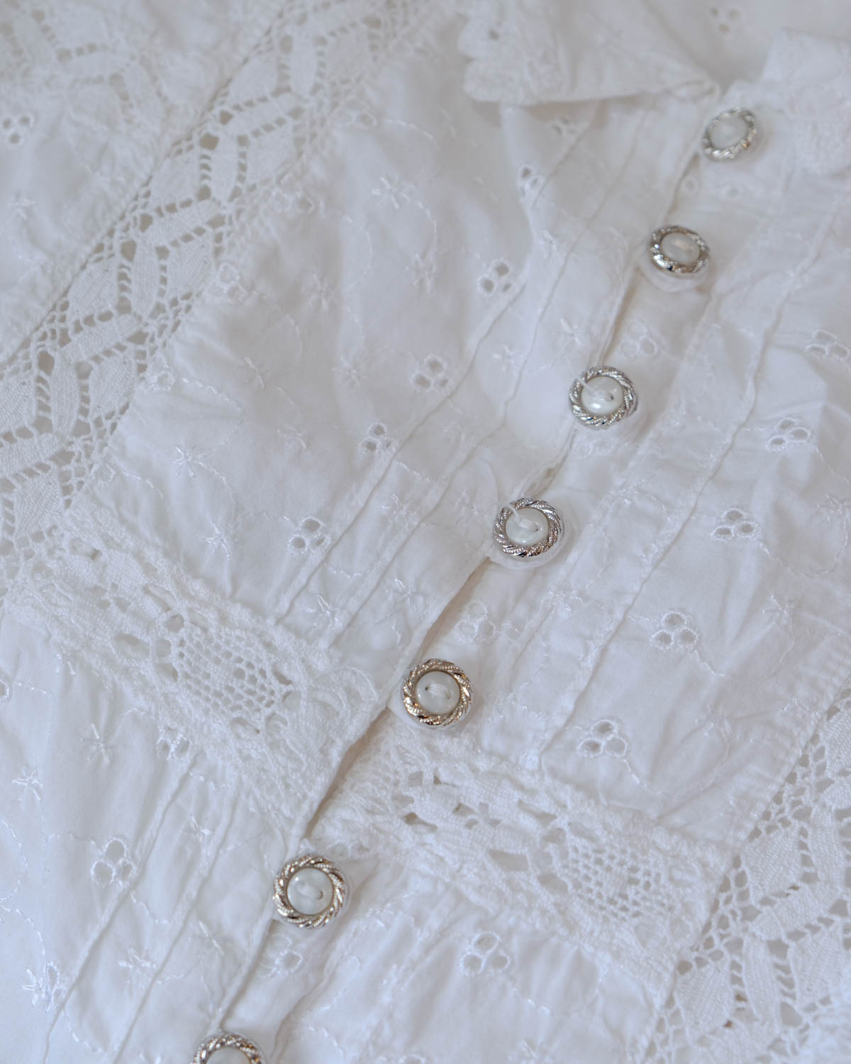 Terry’s romantic eyelet blouse exudes vintage charm with its delicate white cotton fabric and intricate lace-like embroidery. The button-down front and scalloped collar add a whimsical, coquette touch, perfect for a dreamy, cottage coreaesthetic.