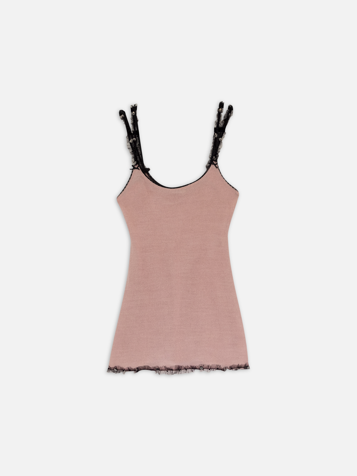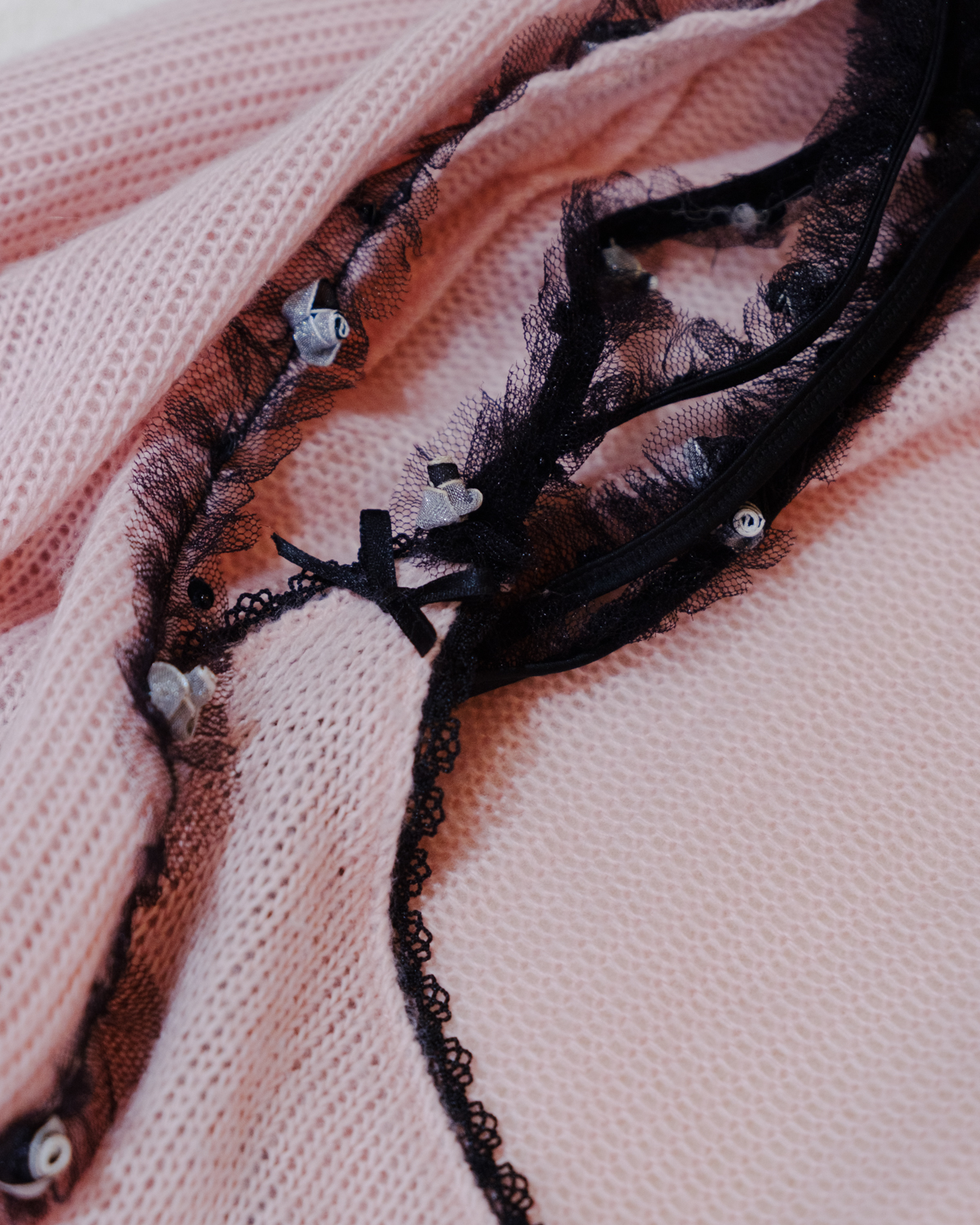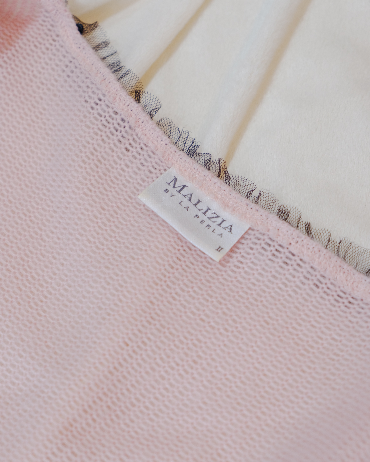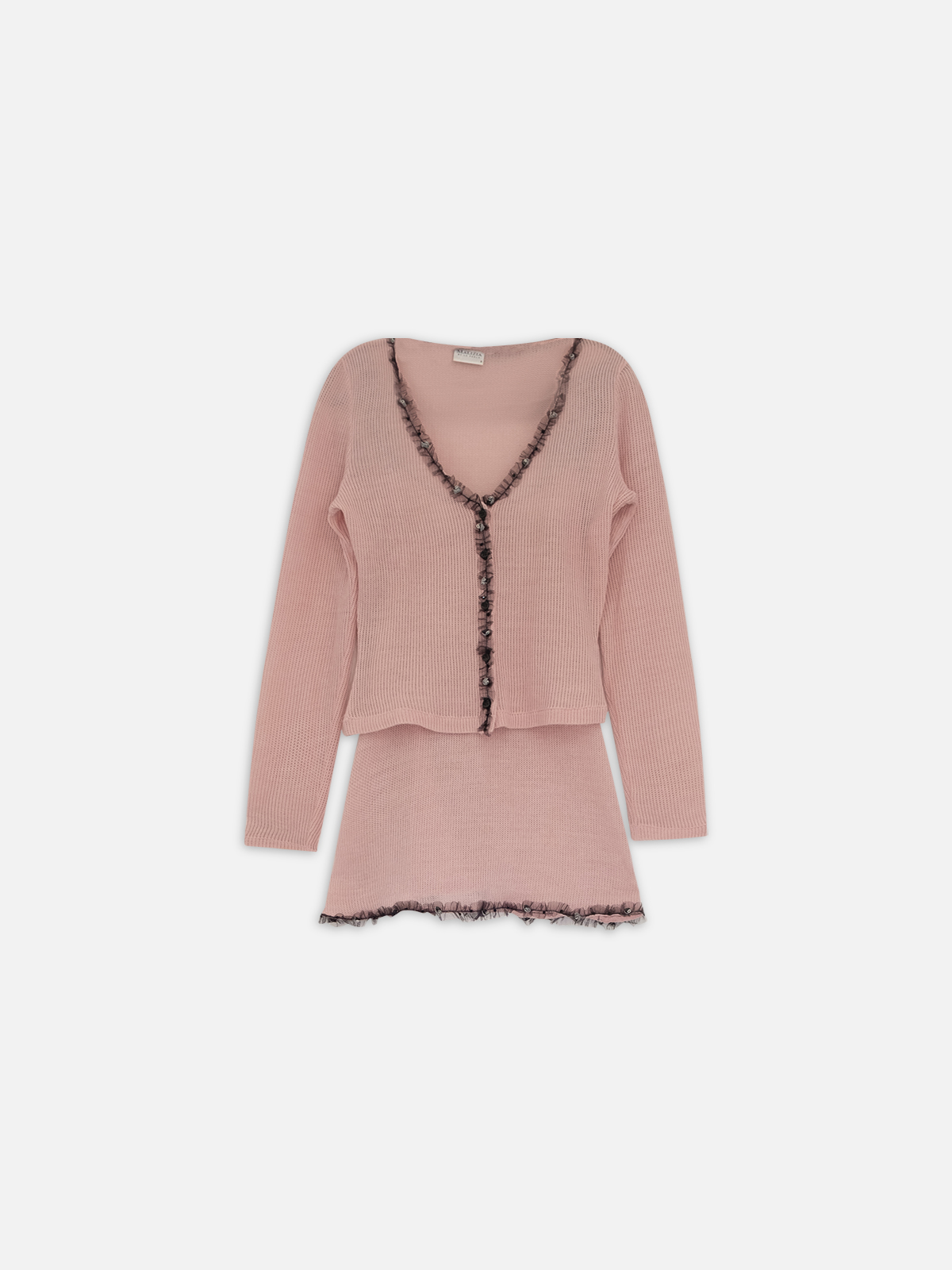 Malizia La Perla’s romantic rose-pink knitwear set, featuring a sleeveless ribbed mini dress with delicate black lace trim at the neckline and hem. The matching long-sleeve cardigan, also adorned with lace detailing and button closure, adds a touch of vintage elegance, perfect for a cozy look either at home or to your favorite spot.