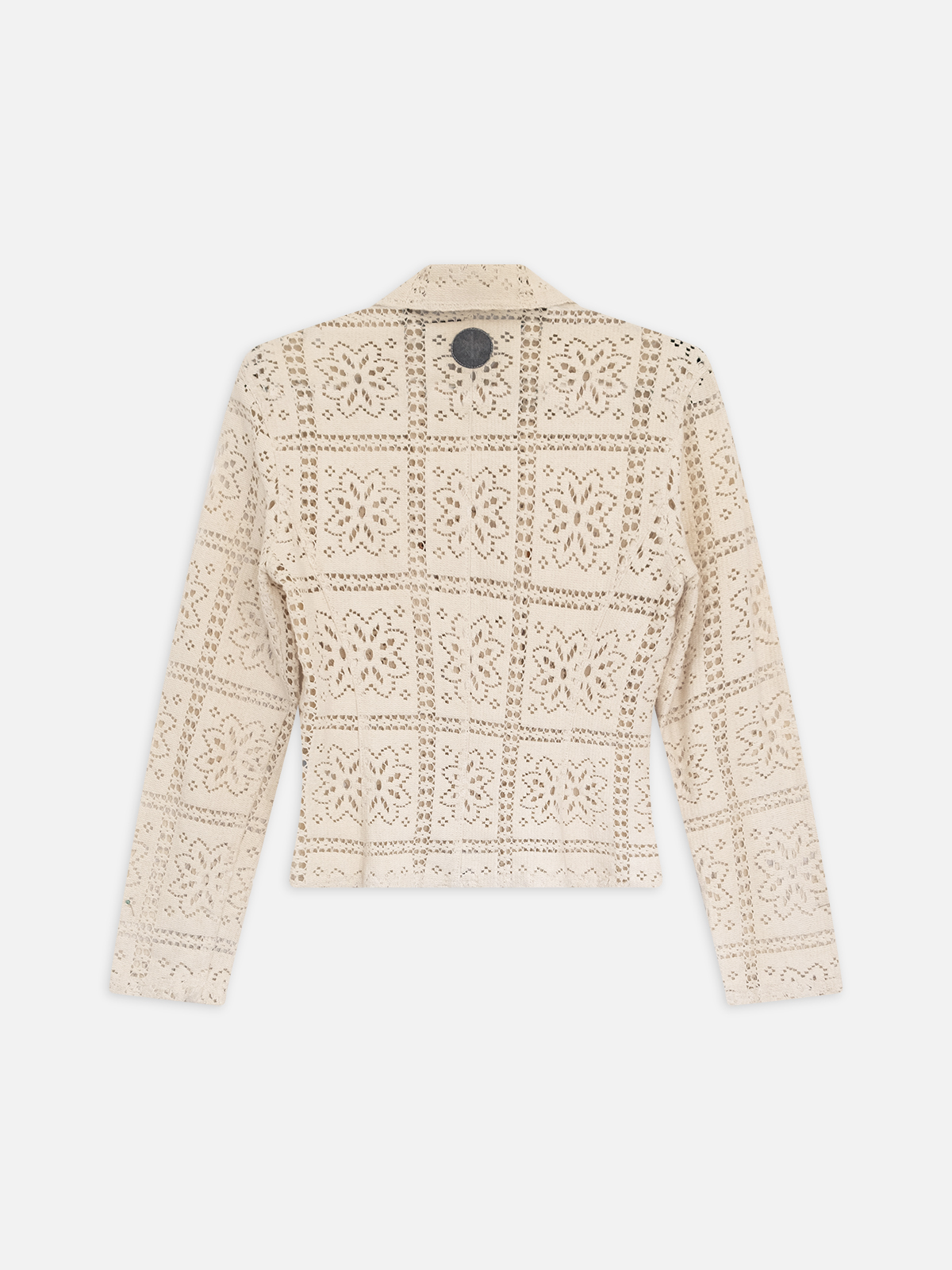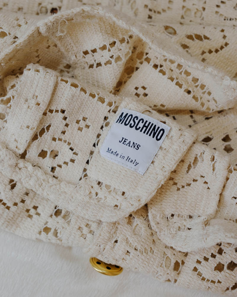 Moschino’s exquisite crochet jacket, showcasing intricate cream lacework with a repeating floral motif. The structured collar, gold-tone buttons, and chest pockets add a touch of vintage charm, while the cotton construction makes it perfect for the transitional season