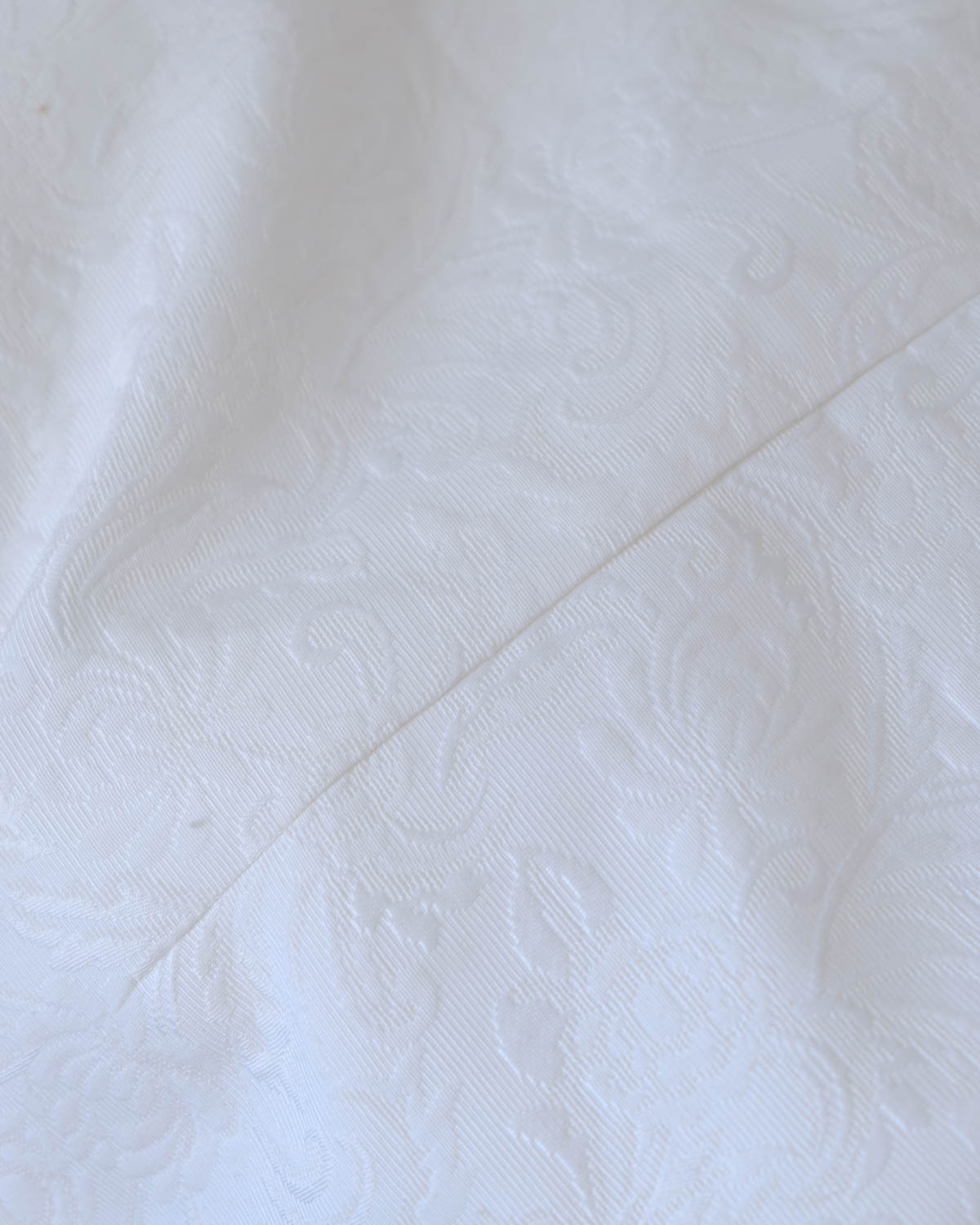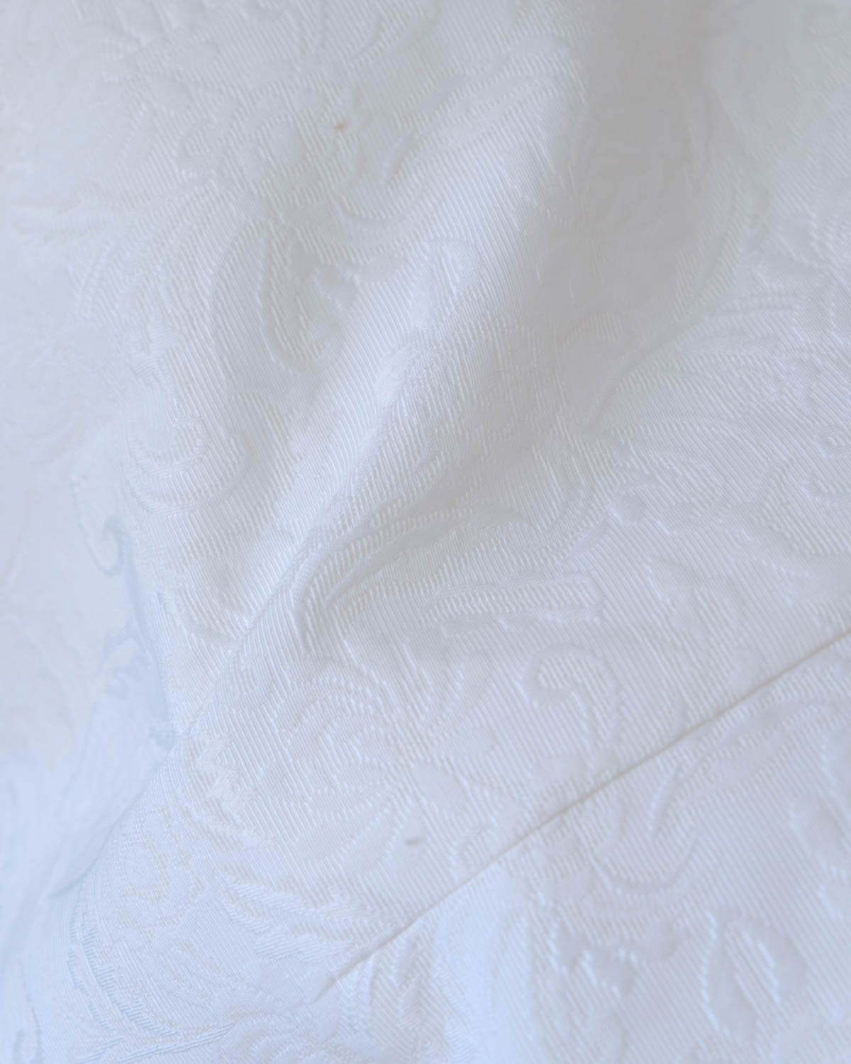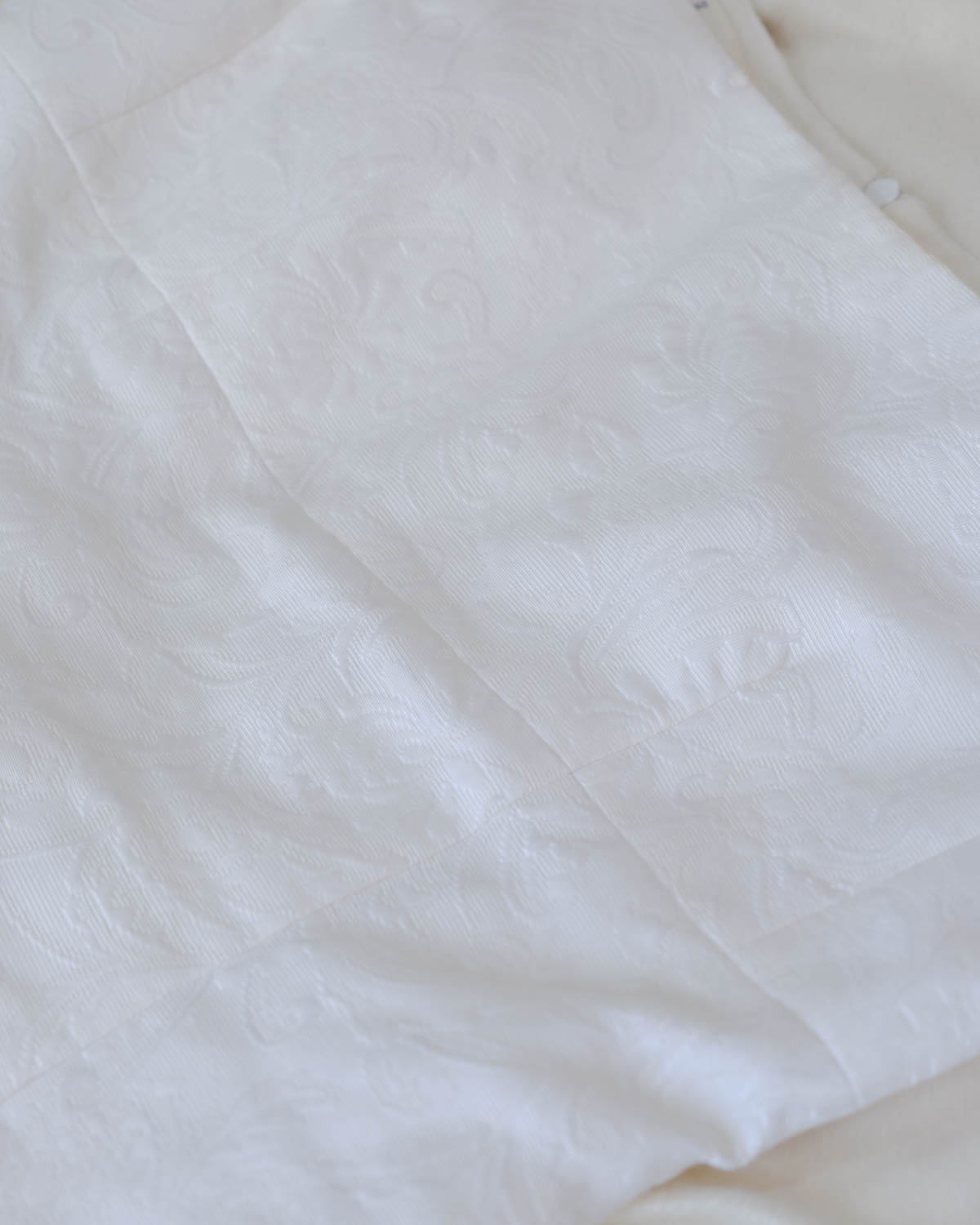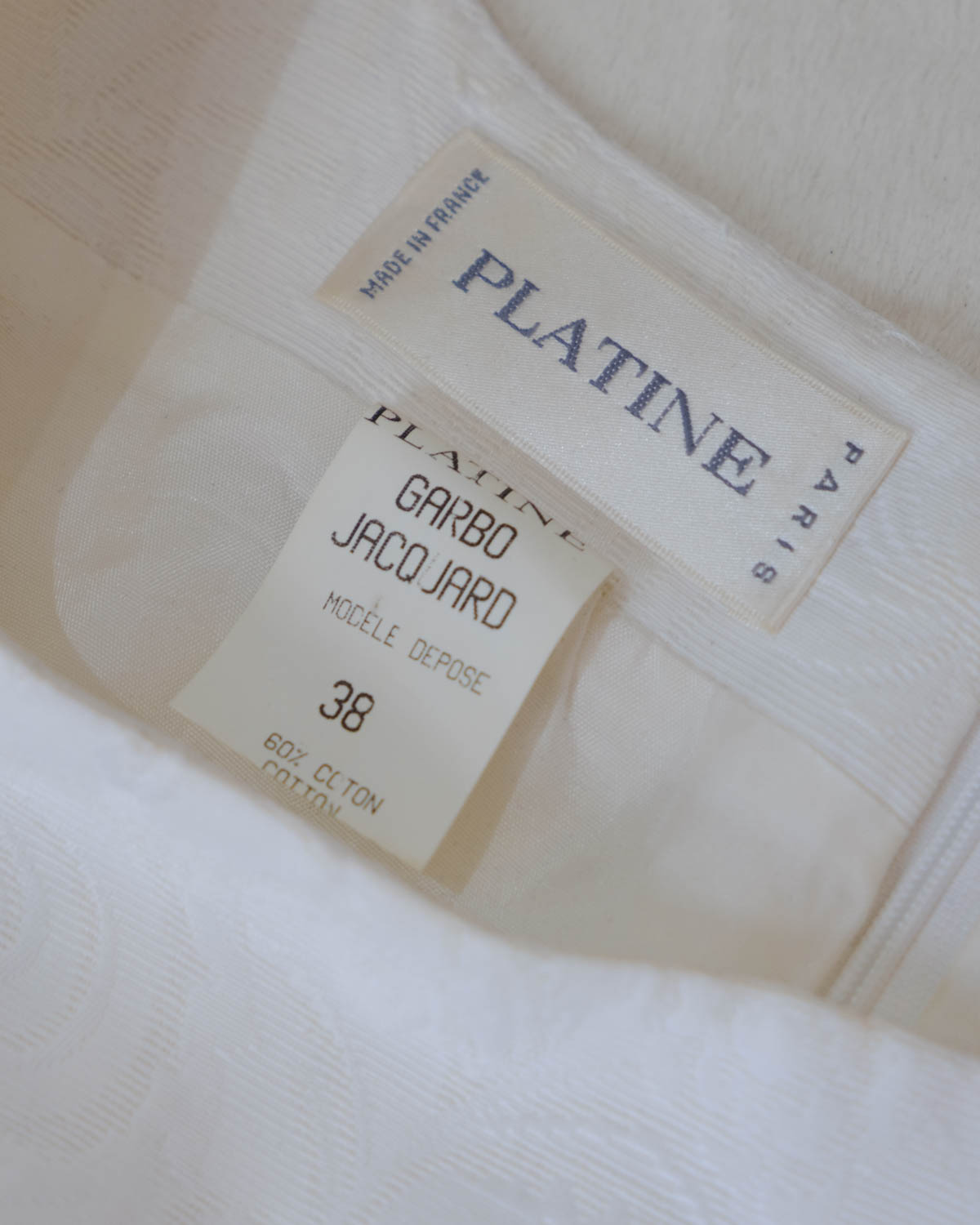 Platine Paris’ chic white jacquard mini dress, exuding effortless French sophistication. The structured square neckline and short sleeves create a polished, minimalist silhouette, while the textured jacquard fabric adds depth and a touch of modern elegance. This fitted dress hugs the body like a glove, ideal for a sleek, refined look.
